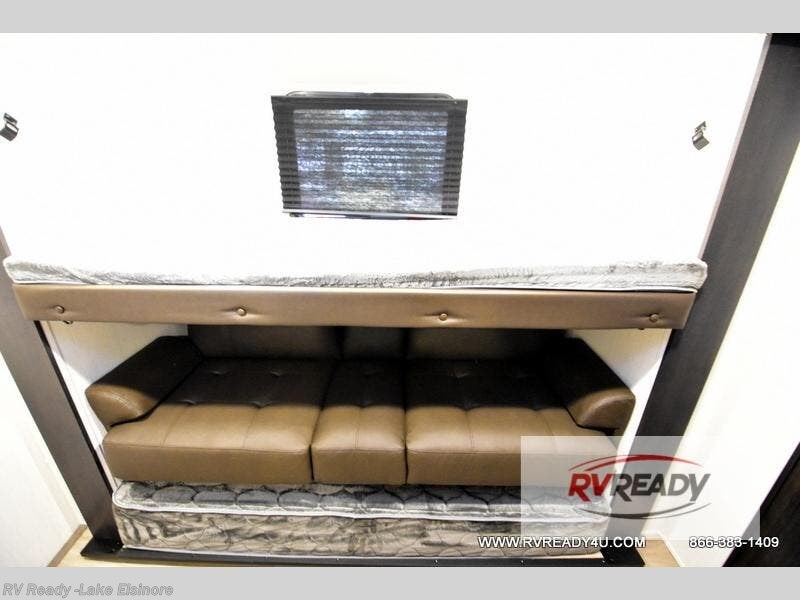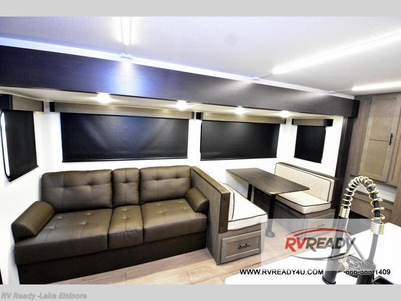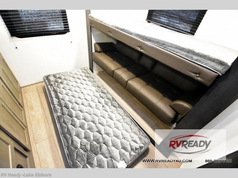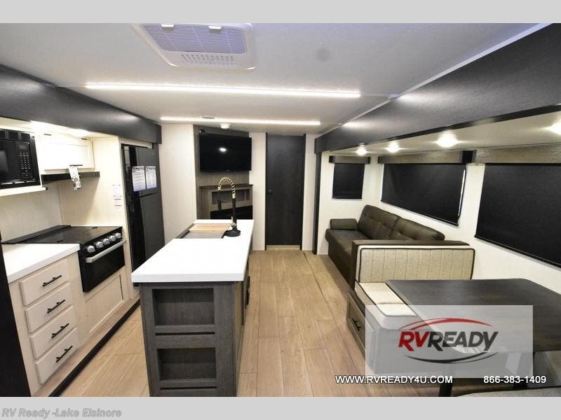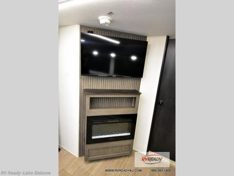Load up your clothes, food, and outdoor gear to enjoy a long weekend away from the city in this travel trailer! There are triple slide outs, a private bunkhouse with a half bathroom with a second exterior entry/door for convenience, plus an outside kitchen! The bunkhouse also has two bunks, a jackknife sofa and a trundle bed, plus a slide out for more interior floor space. The main living and kitchen area is spacious as well with two opposing slides, a kitchen island with a large sink, a pantry, plus a cozy fireplace. The full walk-through bathroom allows double access, and the front bedroom allows you to sleep like royalty.