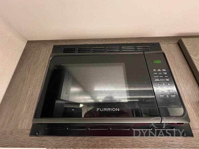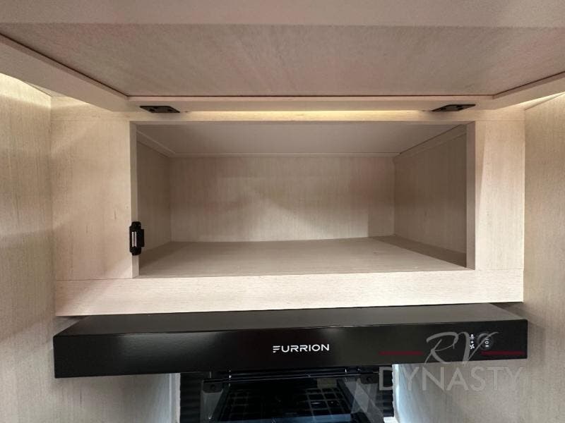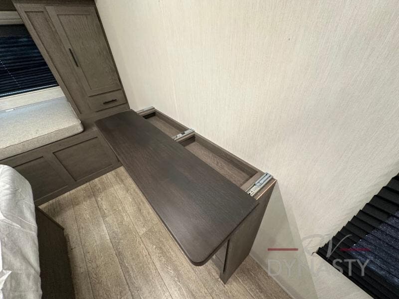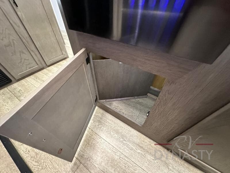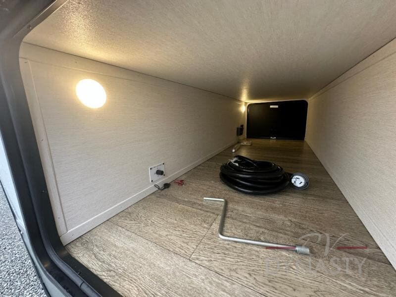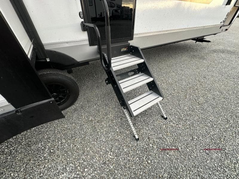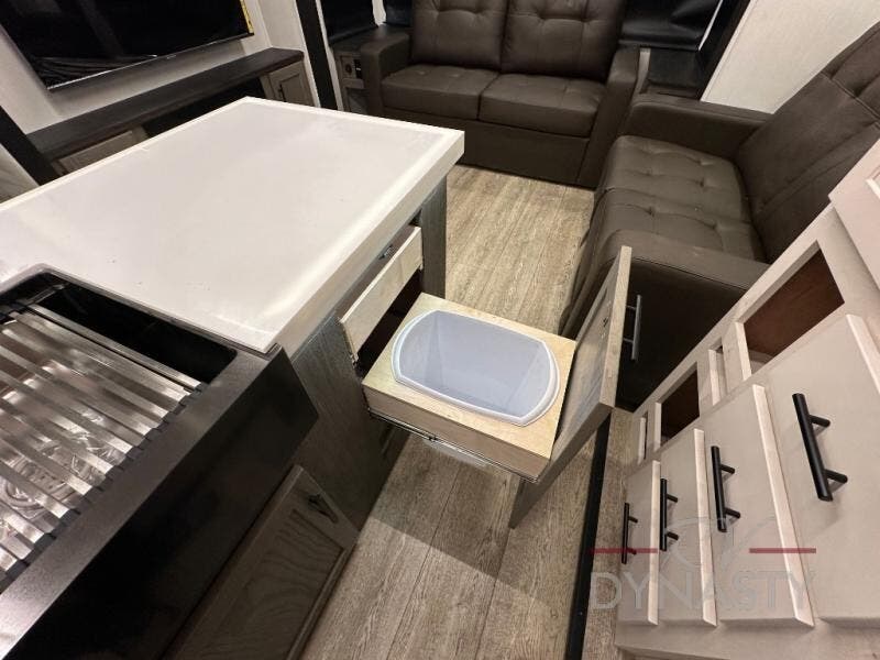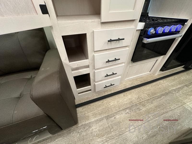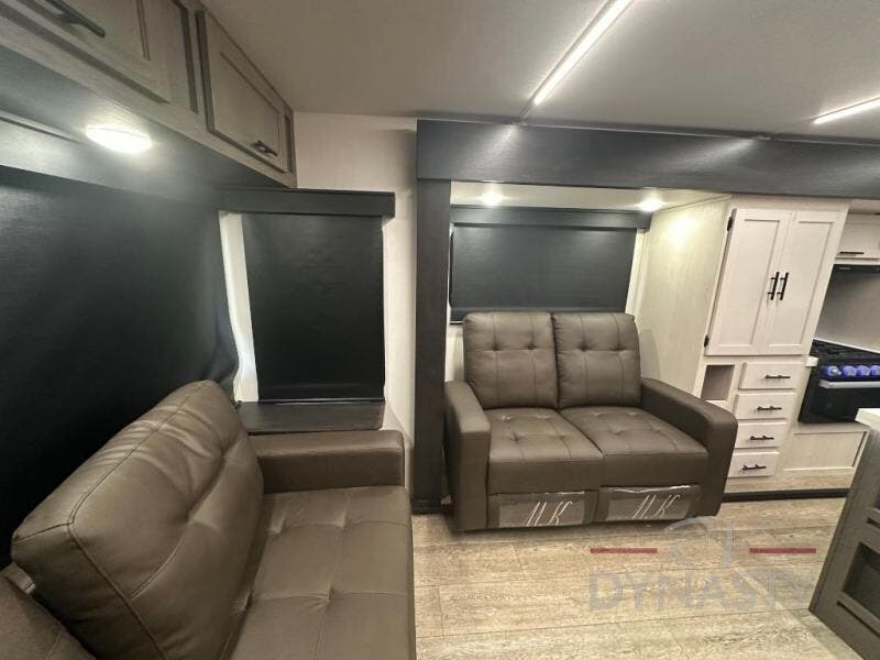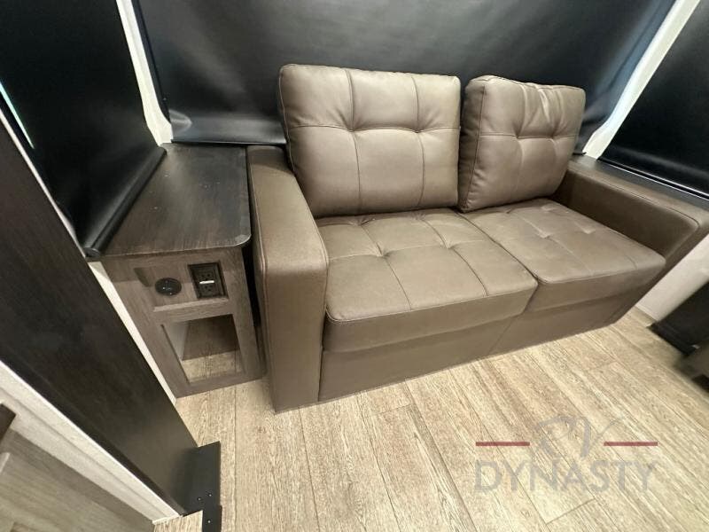 It will be so easy to find comfort in this travel trailer! The dual opposing slides in the combined kitchen and living room will create an open floorplan you are sure to love. There is a rear tri-fold sofa, theater seating across from an entertainment center, plus a table with chairs and a storage ottoman seat to keep games organized. The chef of your group will love having extra counter space provided by the kitchen island, and there is a hutch to keep nice dishes stored away. Up front, the private bedroom includes a king bed slide out, dual wardrobes and a dresser, plus a front sun bench where you can sit to pull your hiking boots on. There is even a wardrobe with washer and dryer prep if you choose to add those appliances!