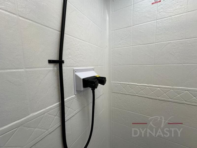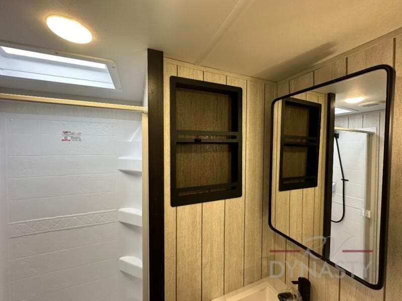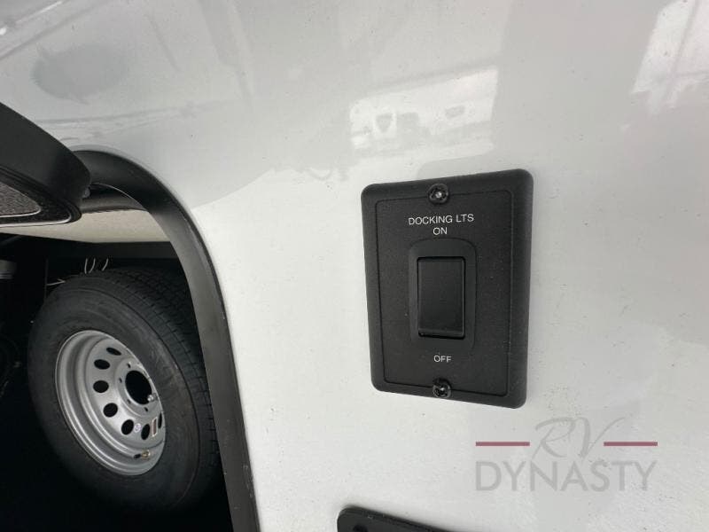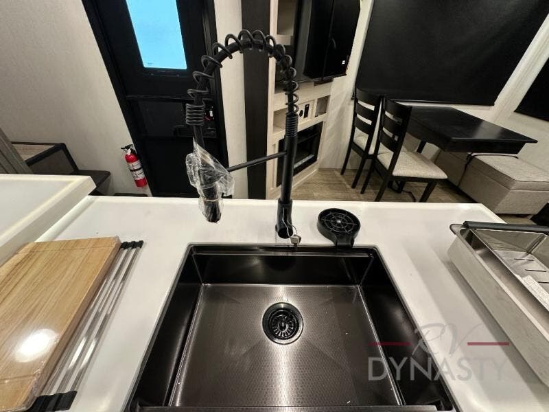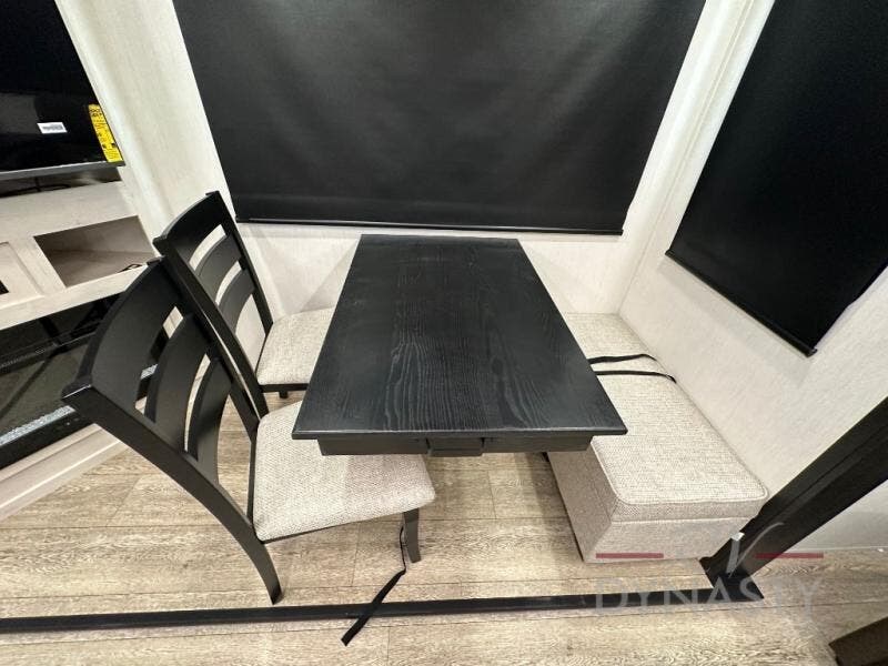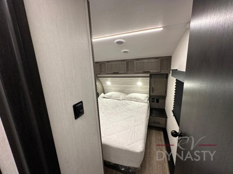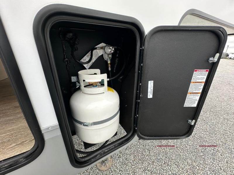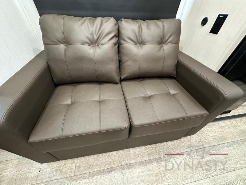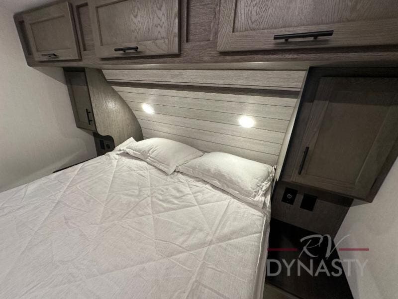 This fifth wheel is perfect for couple's but also has enough space for company too! The rear living area features two recliners with a middle table side to set your cup of coffee, a tri-fold sofa that can transform into an extra sleeping space, and free standing table with chairs and storage ottoman seat to enjoy your meals by the electric fireplace. The fully equipped kitchen has everything you need including a counter peninsula, 12V refrigerator, and plenty of storage. After a fun-filled day at the beach, rinse off in the full bathroom that includes a spacious shower, porcelain toilet, and convenient shower caddy. The front private bedroom has a queen bed to lay your head on at night and there is even USB ports on either side to charge your electronics!
