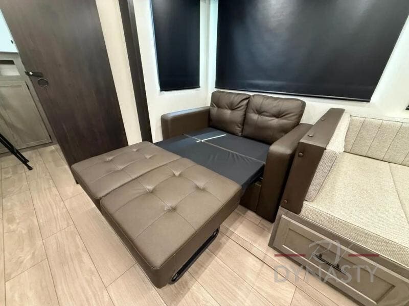Invite the whole gang with this spacious fifth wheel in tow! The rear private bunkhouse includes triple bunks, a dinette, plus a TV stand with a dresser to keep your space tidy. You'll find a queen bed in the front private bedroom, along with two wardrobes and an overhead cabinet for books. Everyone can meet in the combined kitchen and living area to relax on the tri-fold sofa, play a game around the U-shaped dinette, or just enjoy the fireplace! The chef of your group will have an interior kitchen to cook meals each day, or they can head outside to use the outdoor kitchen with a refrigerator. There is also a 20' patio awning and outside storage to keep hiking gear packed away.