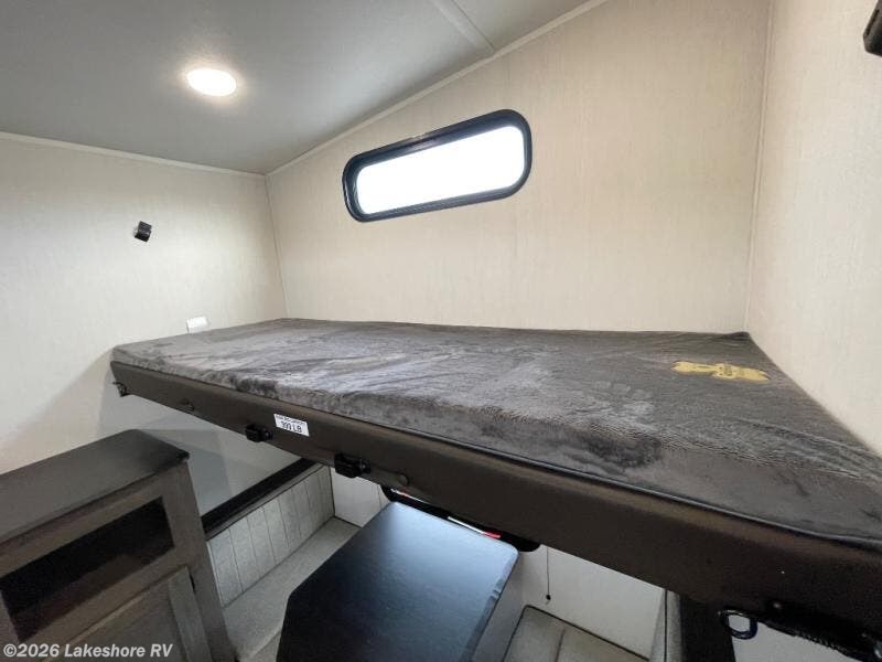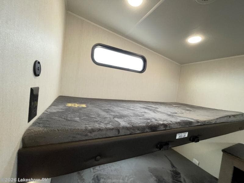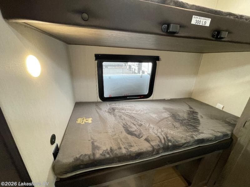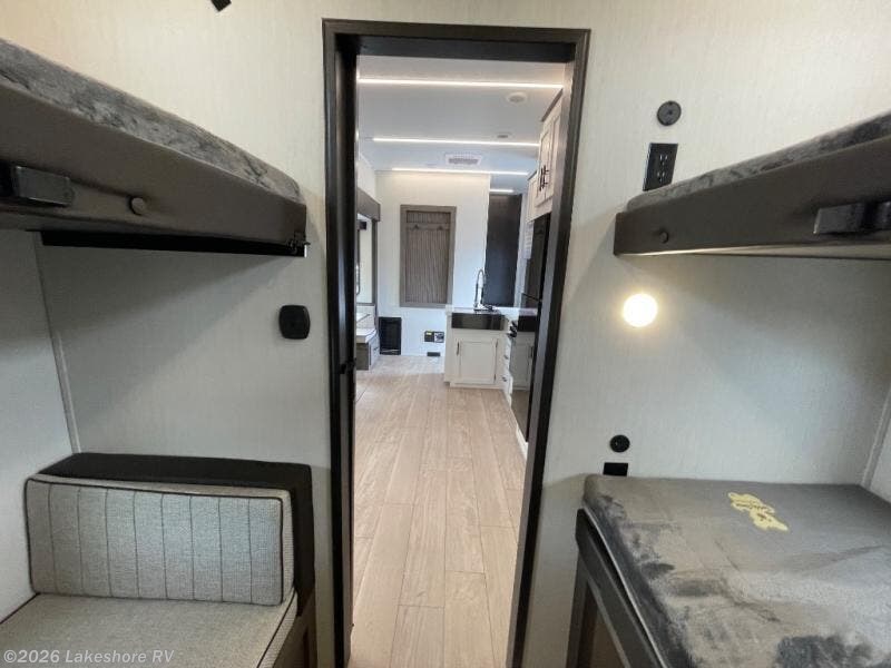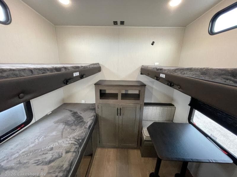 Rear Private Bunkhouse – Perfect for kids or guests, featuring triple bunks, a dinette for meals or games, plus a dresser and TV stand.