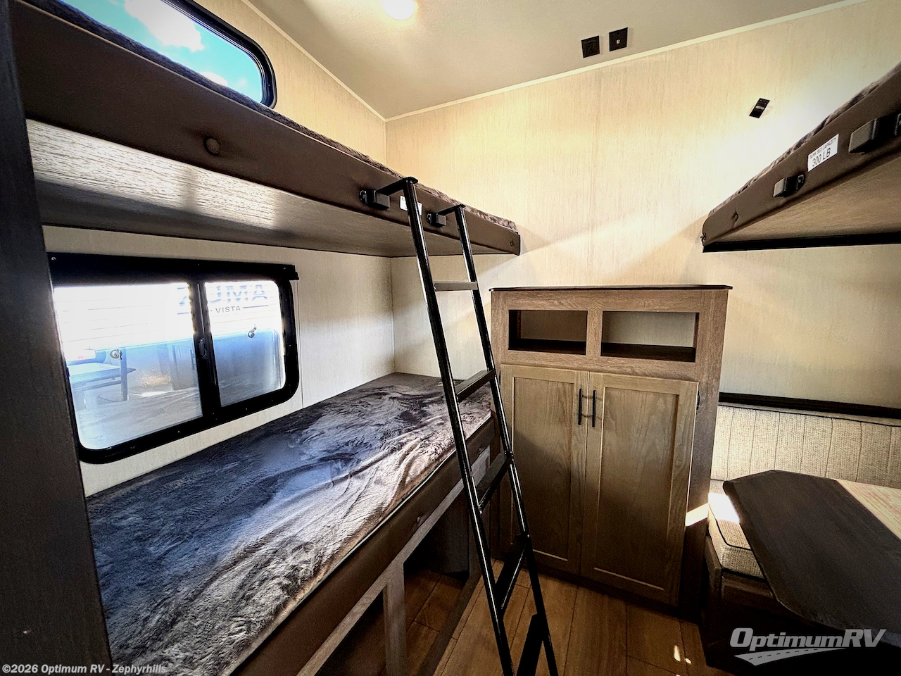Invite the whole gang with this spacious fifth wheel in tow! The rear private bunkhouse includes triple bunks, a dinette, plus a TV stand with a dresser to keep your space tidy. You'll find a queen bed in the front private bedroom, along with two wardrobes and an overhead cabinet for books. Everyone can meet in the combined kitchen and living area to relax on the tri-fold sofa, play a game around the U-shaped dinette, or just enjoy the fireplace! The chef of your group will have an interior kitchen to cook meals each day, or they can head outside to use the outdoor kitchen with a refrigerator. There is also a 20' patio awning and outside storage to keep hiking gear packed away.