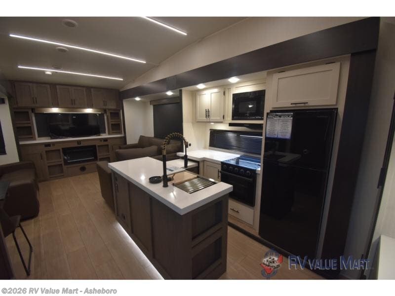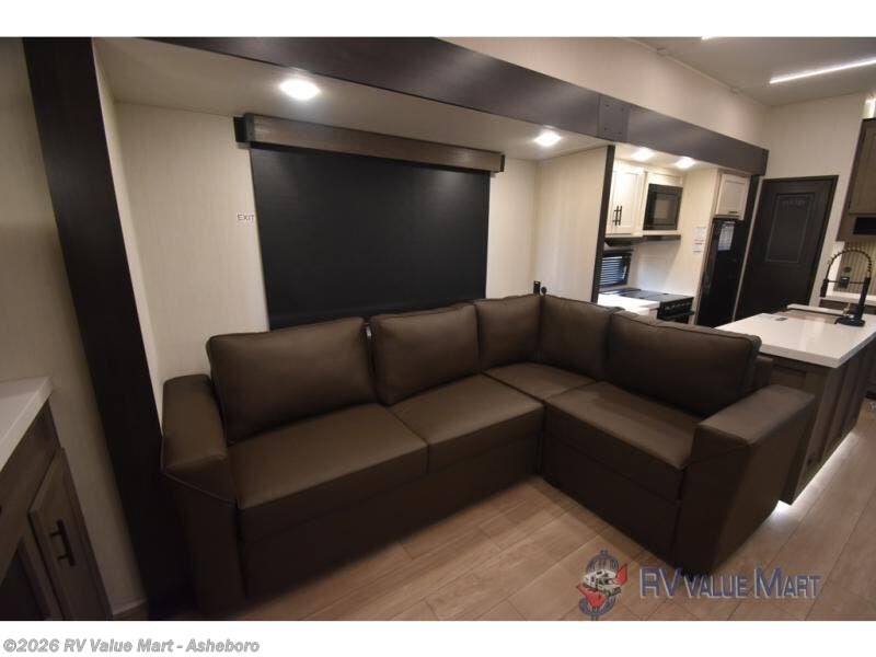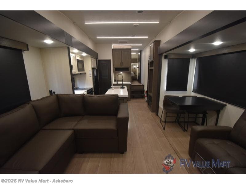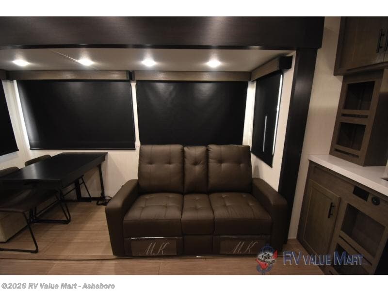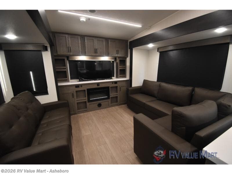 Enjoy time at the campground in this spacious fifth wheel! Once you arrive at the campground, you can unload the outside storage, put out the 15' awning, then head inside to make lunch on the three burner cooktop. Your crew can dine at the free-standing table and chairs, then relax on the dual tri-fold sofas. There is also theater seating, all in great view of the rear televator TV and fireplace. A full bath with a spacious shower will let you freshen up before bed, and the queen bed in the front bedroom is sure to bring a great night's rest!