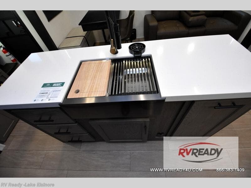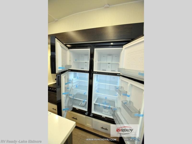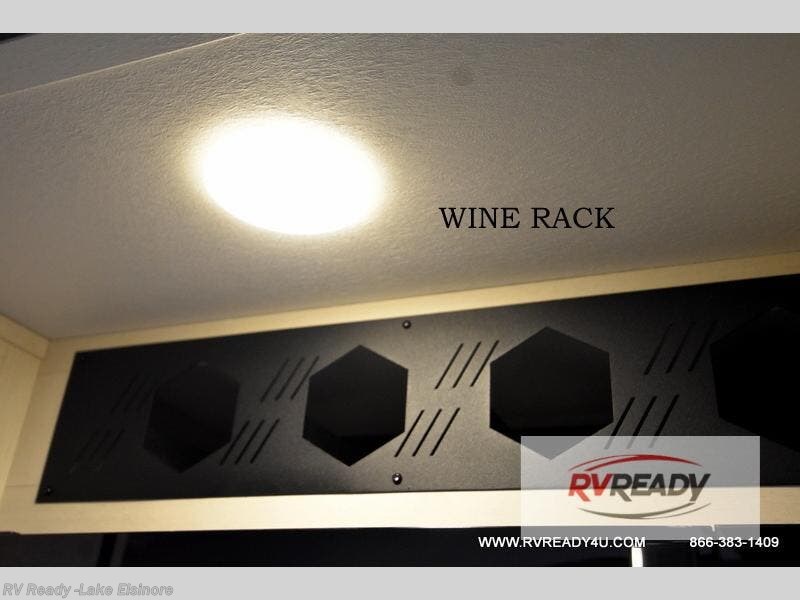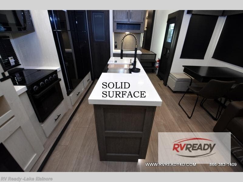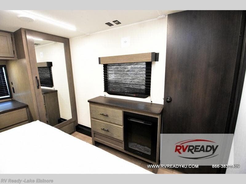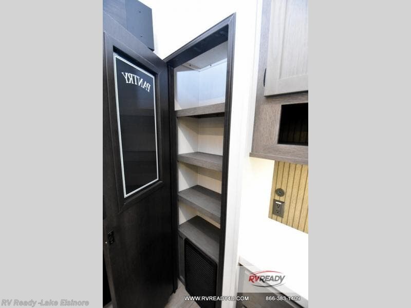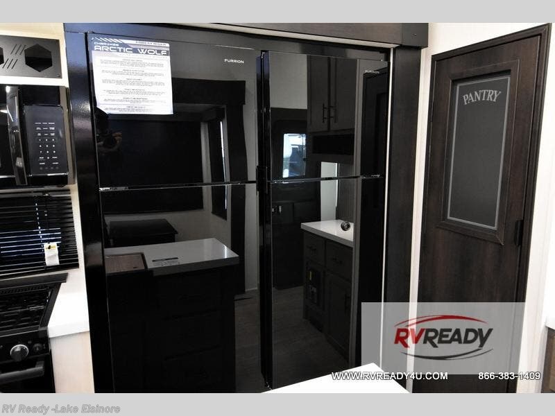 This Cherokee Arctic Wolf fifth wheel is quite extraordinary and accommodating! It has a set of opposing slides in the main living area so you can have more space to sit back on the theater seating and tri-fold sofa. You can switch on the fireplace to add some warmth to this space if it's a cool night. The free-standing table and chairs is going to be great for sitting down to eat a meal together, and there is even a storage ottoman seat for board games or throw blankets. You'll also be able to grab dessert from the large hidden pantry closet to go with your coffee. The private bedroom up front is going to provide great relaxation with its king bed slide. The spacious wardrobe includes washer/dryer prep, and there's even a second fireplace in the bedroom for the ultimate in coziness.