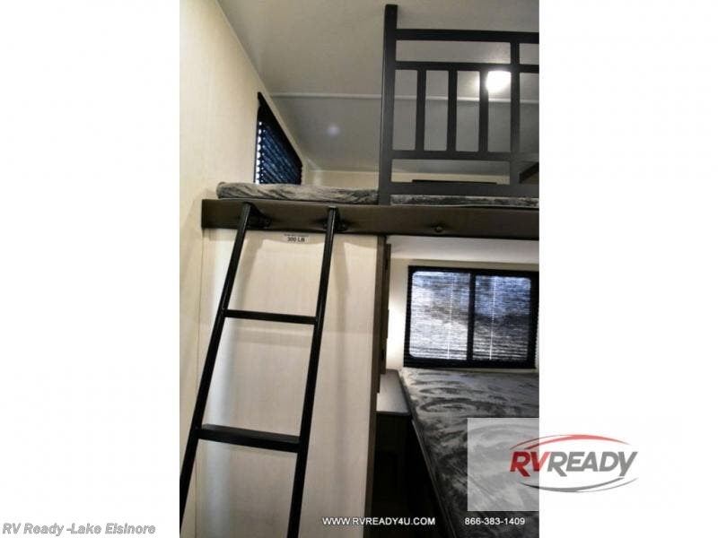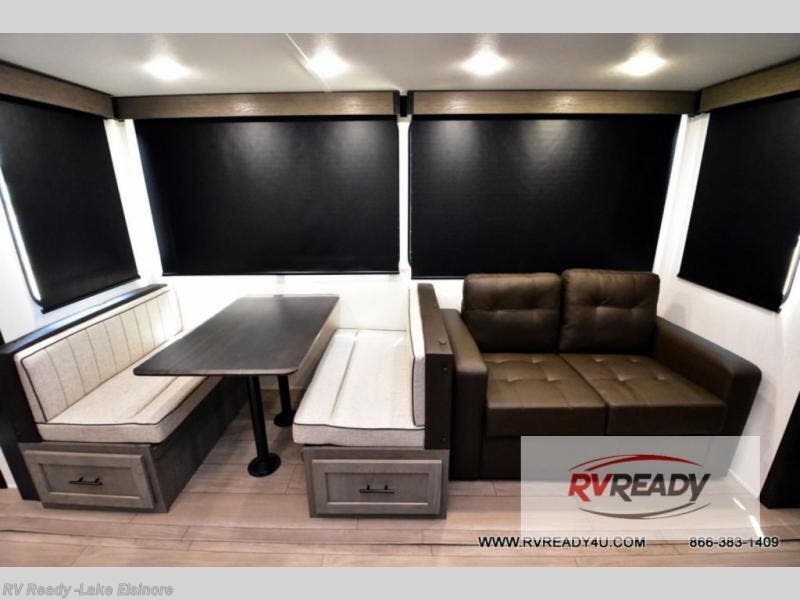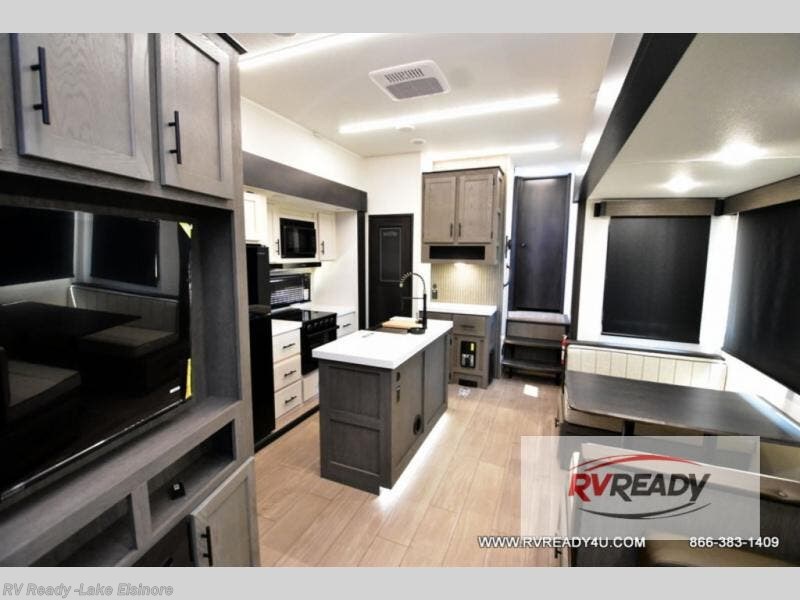 There's not much about this fifth wheel that you won't love! Your guests can claim the rear bunkhouse suite with a 54" x 74" bunk/bed, a 60" x 80" loft bunk, and a half bath for added convenience. You'll have the front private bedroom all to yourselves, and the spacious full bath is close by for easy nighttime use. Everyone can meet in the combined kitchen and living area that is made open thanks to the dual opposing slides. There is also a kitchen island with a trash can, a pull-out countertop extension, a booth dinette, and a tri-fold sofa across from the fireplace; how cozy!