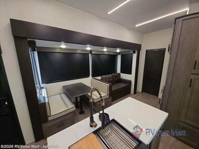 There's not much about this fifth wheel that you won't love! Your guests can claim the rear bunkhouse suite with a 54" x 74" bunk/bed, a 60" x 80" loft bunk, and a half bath for added convenience. You'll have the front private bedroom all to yourselves, and the spacious full bath is close by for easy nighttime use. Everyone can meet in the combined kitchen and living area that is made open thanks to the dual opposing slides. There is also a kitchen island with a trash can, a hutch, a booth dinette, and a tri-fold sofa across from the fireplace; how cozy!