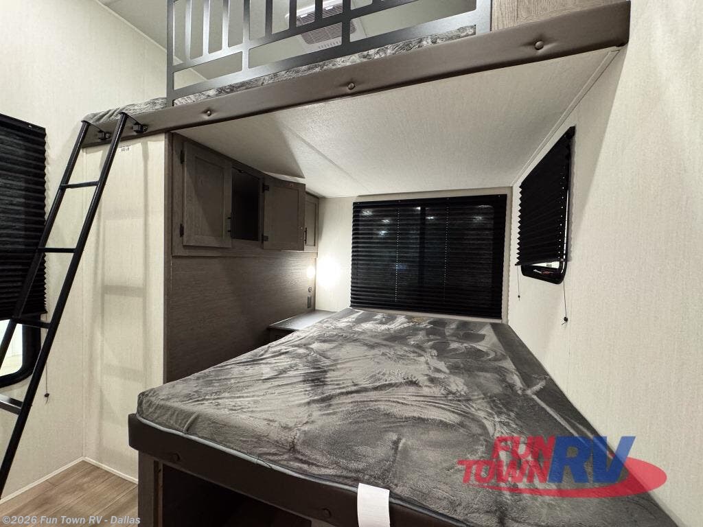 This Cherokee Arctic Wolf fifth wheel is an excellent choice if you have a large family that wants to get away! Not only is there a private bedroom up front for you, but there is also a bedroom suite in the back. This suite has a 54" x 74" bed, a 60" x 80" loft bed, full under bed storage, a half bathroom all to itself, and the second exterior entry door. What a space! You'll also be highly impressed with the living area because it has a large slide that holds the tri-fold sofa and dinette. The large pantry is another feature you'll appreciate since it can store all of the food needed to feed your group, and the outside kitchen is an added bonus the cook will love!
