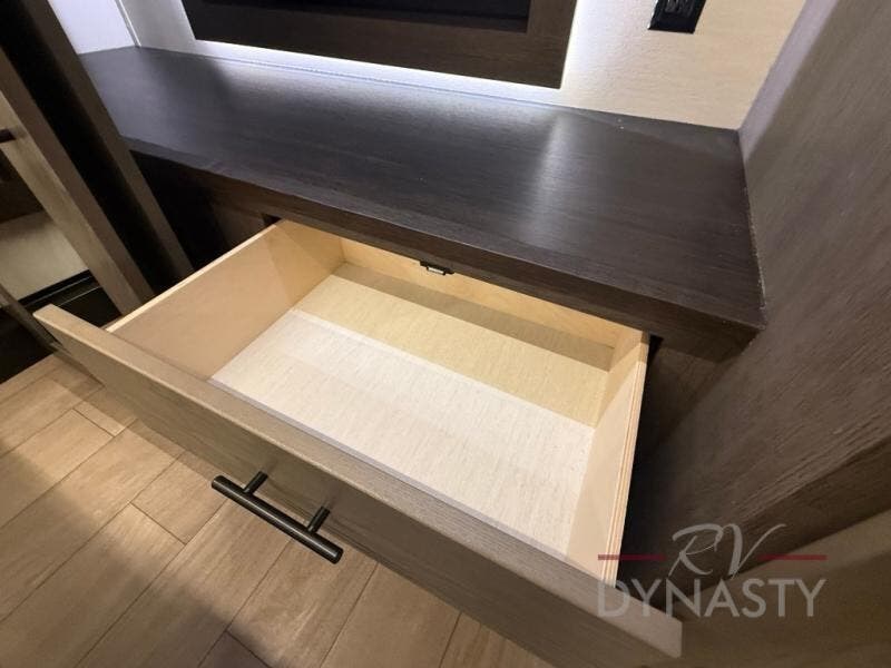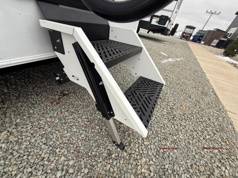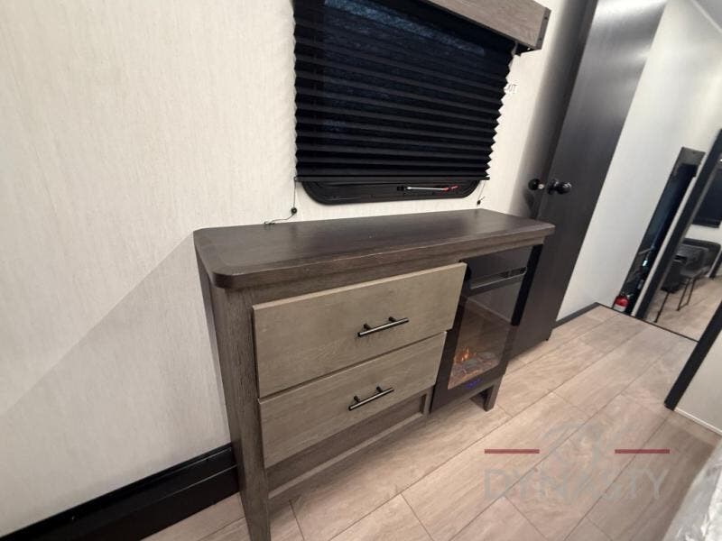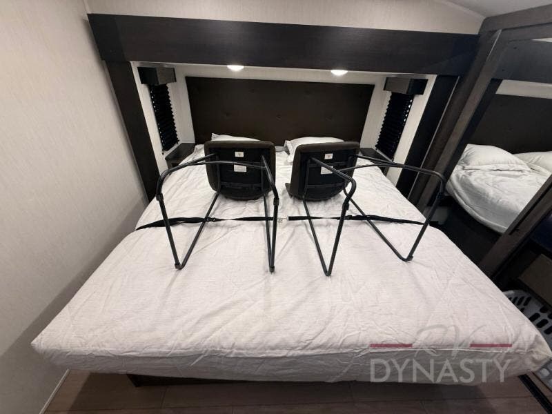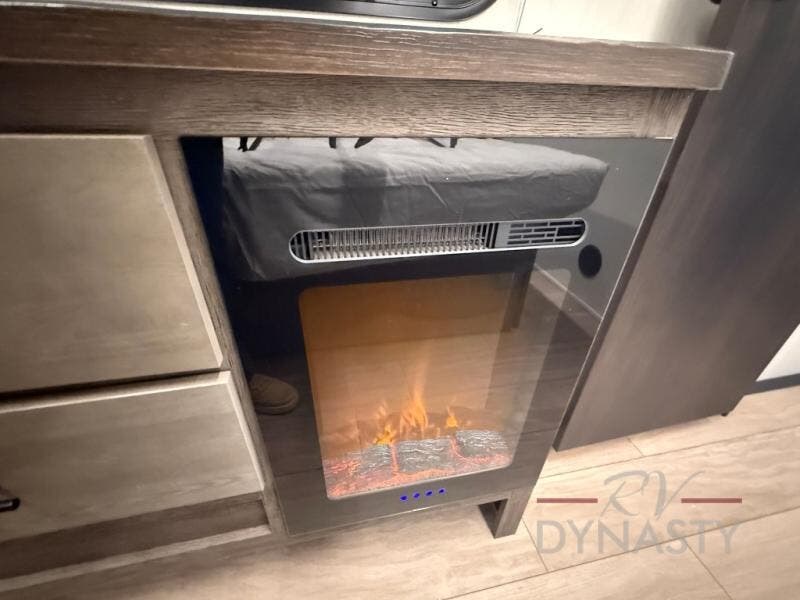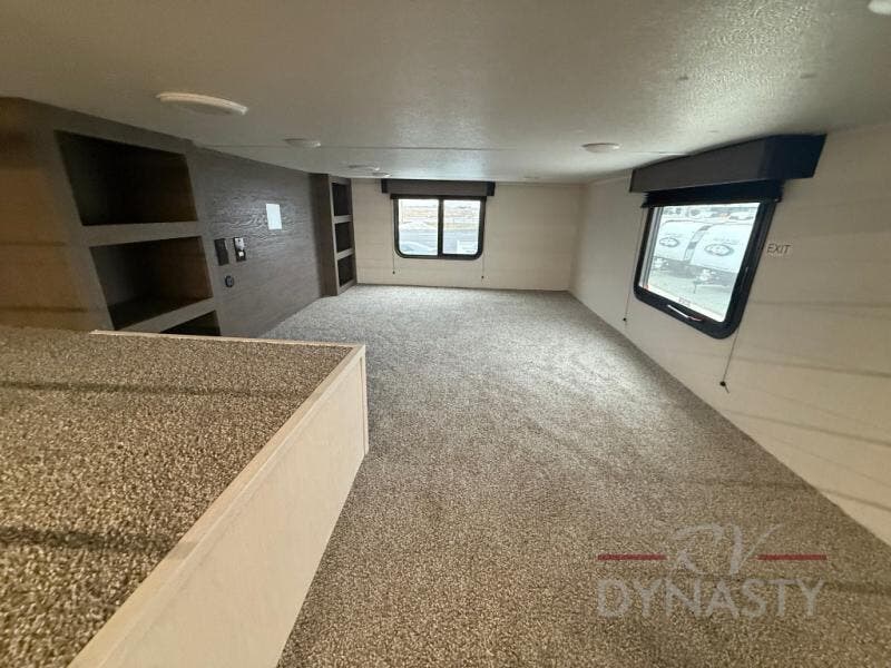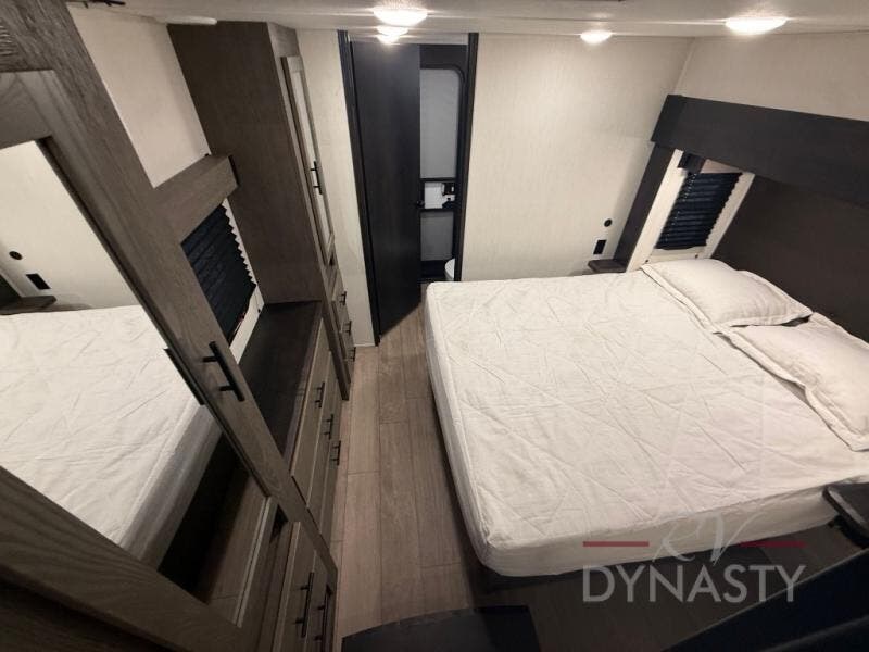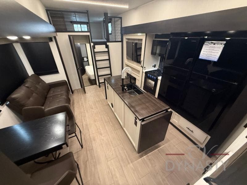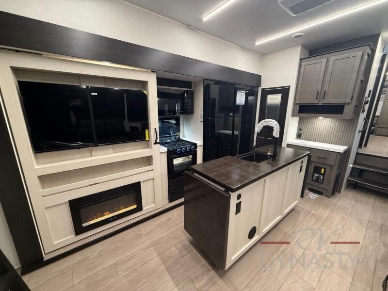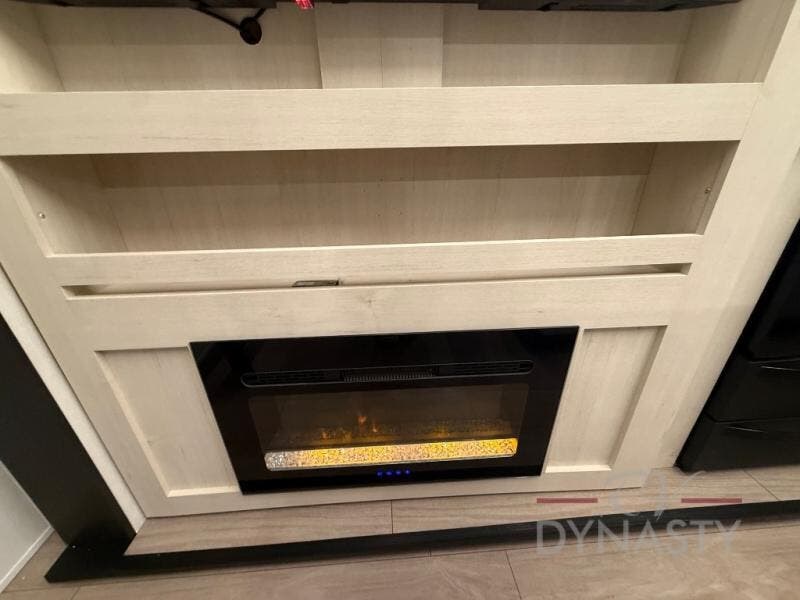 This quad-slide layout is set up for long stays and easy routines. The kitchen centers around a beautiful kitchen island for prep, the free-standing range is perfect for making full-size meals, and clean-up is a breeze with the built-in dishwasher. Across the living/kitchen zone you’ll find seating oriented to the entertainment wall and an LED TV, so movie nights don’t fight the cook space. Up front, the suite’s king bed slide faces a bedroom fireplace, with deep hanging space and drawers to keep wardrobes organized. Outside, the dual entry design improves campsite flow, and the triple-awning coverage stretches usable patio space. There is also more space for kids or guests in the upper loft!
