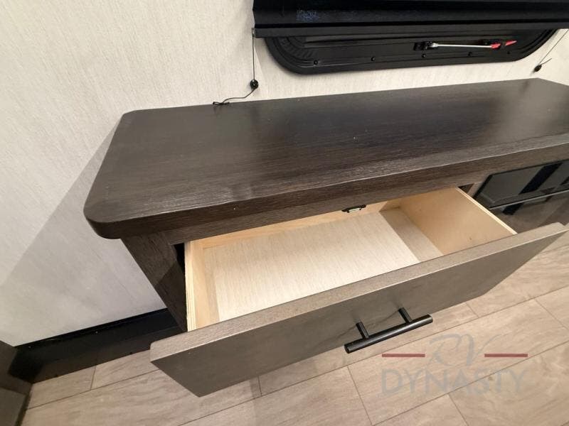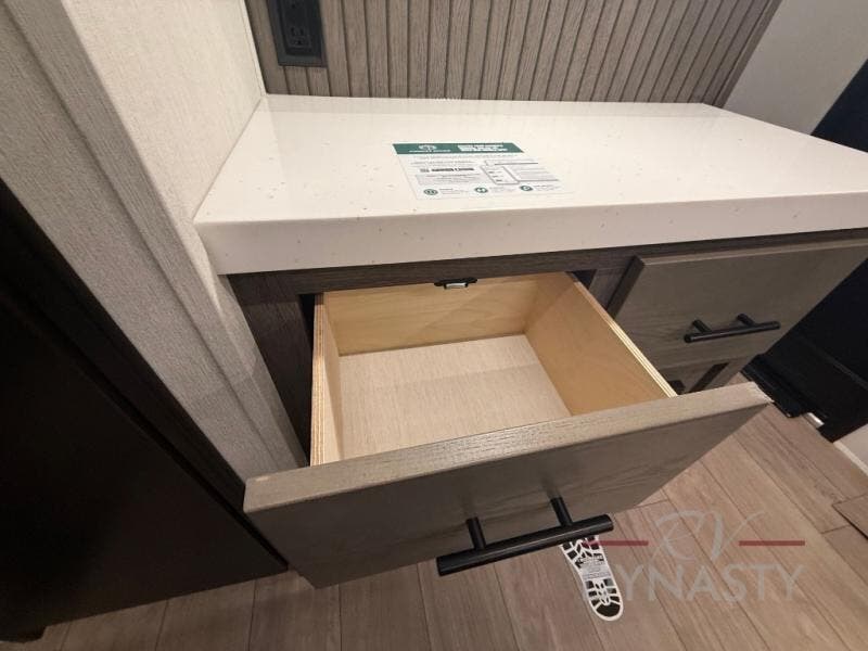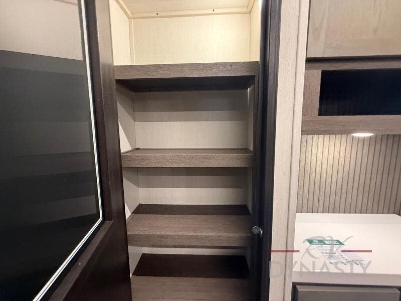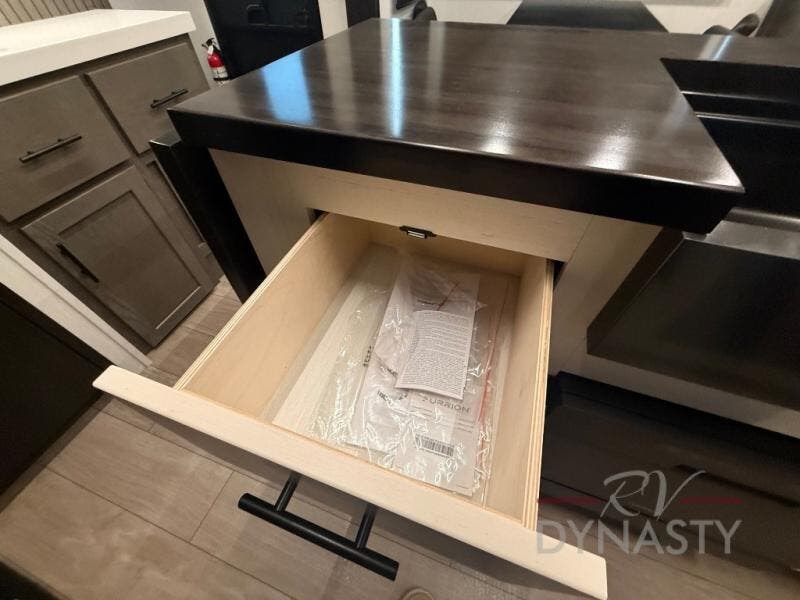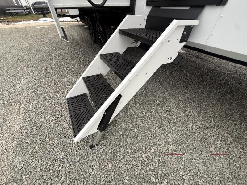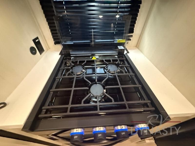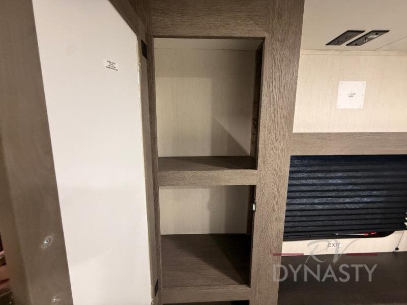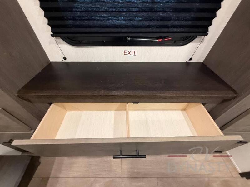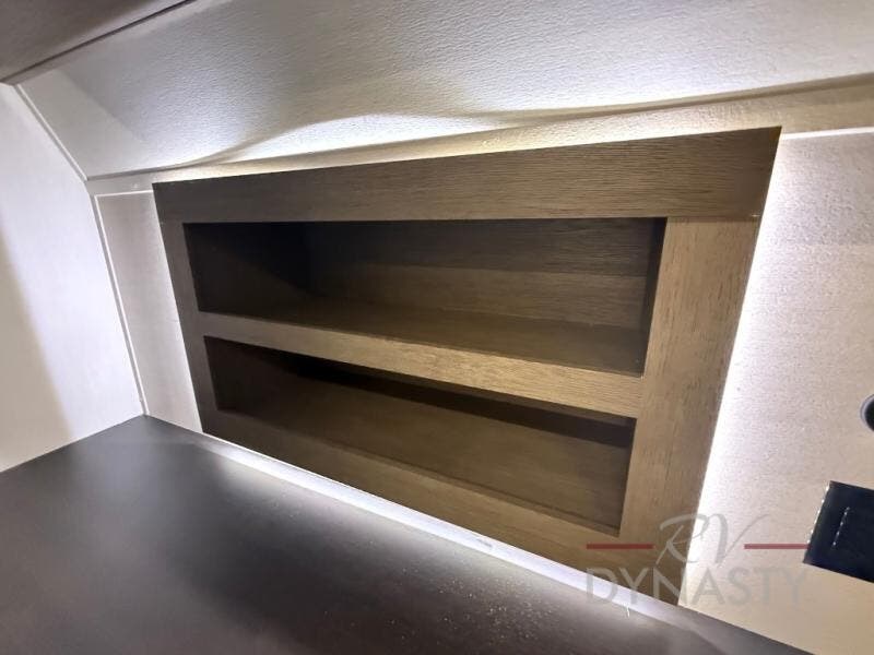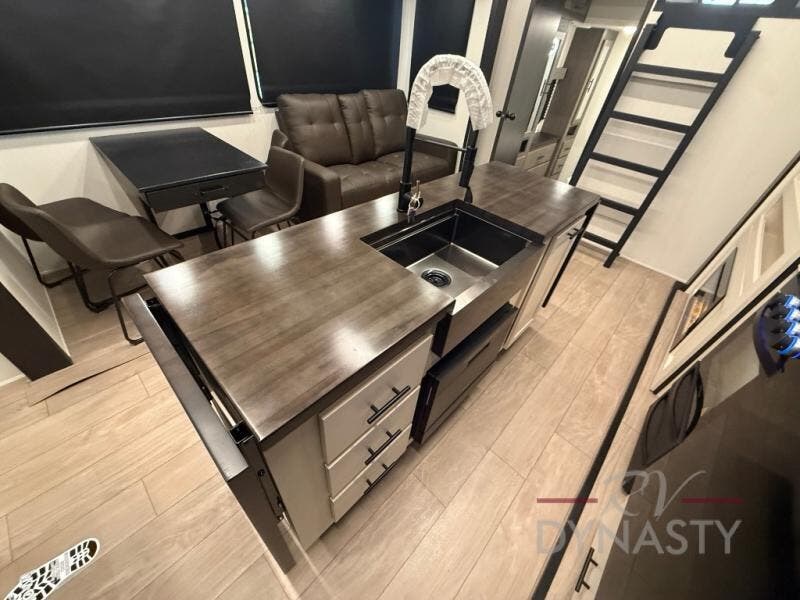This quad-slide layout is set up for long stays and easy routines. The kitchen centers around a beautiful kitchen island for prep, the free-standing range is perfect for making full-size meals, and clean-up is a breeze with the built-in dishwasher. Across the living/kitchen zone you’ll find seating oriented to the entertainment wall and an LED TV, so movie nights don’t fight the cook space. Up front, the suite’s king bed slide faces a bedroom fireplace, with deep hanging space and drawers to keep wardrobes organized. Outside, the dual entry design improves campsite flow, and the triple-awning coverage stretches usable patio space. There is also more space for kids or guests in the upper loft!