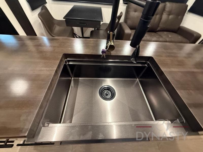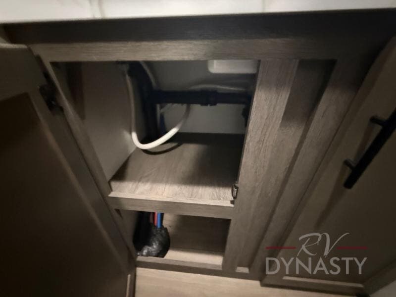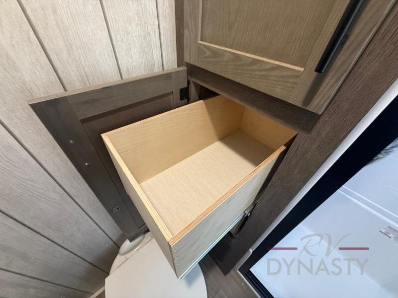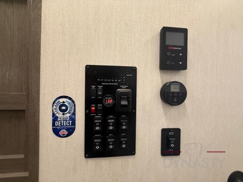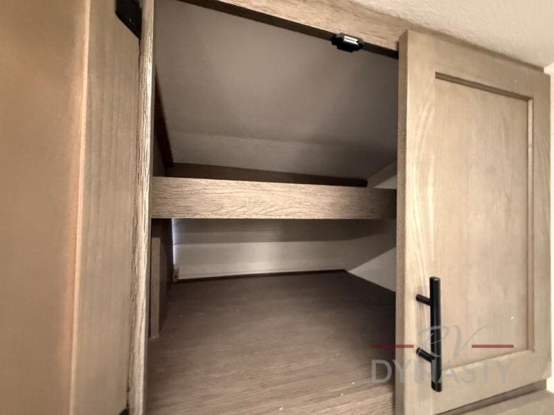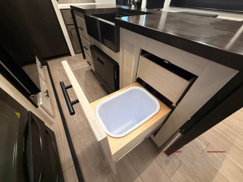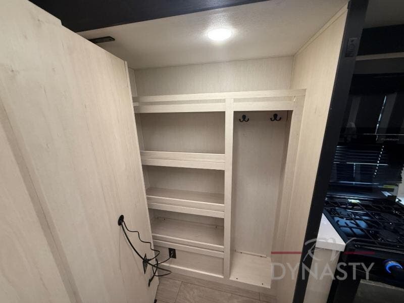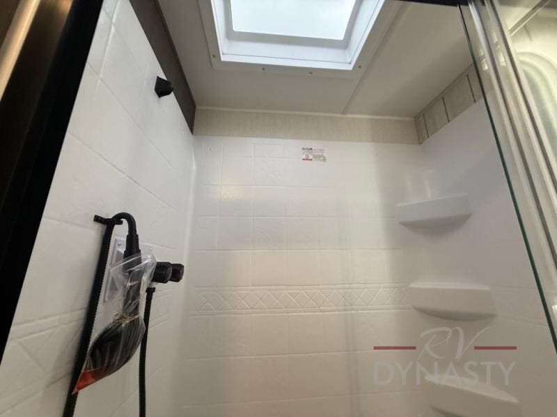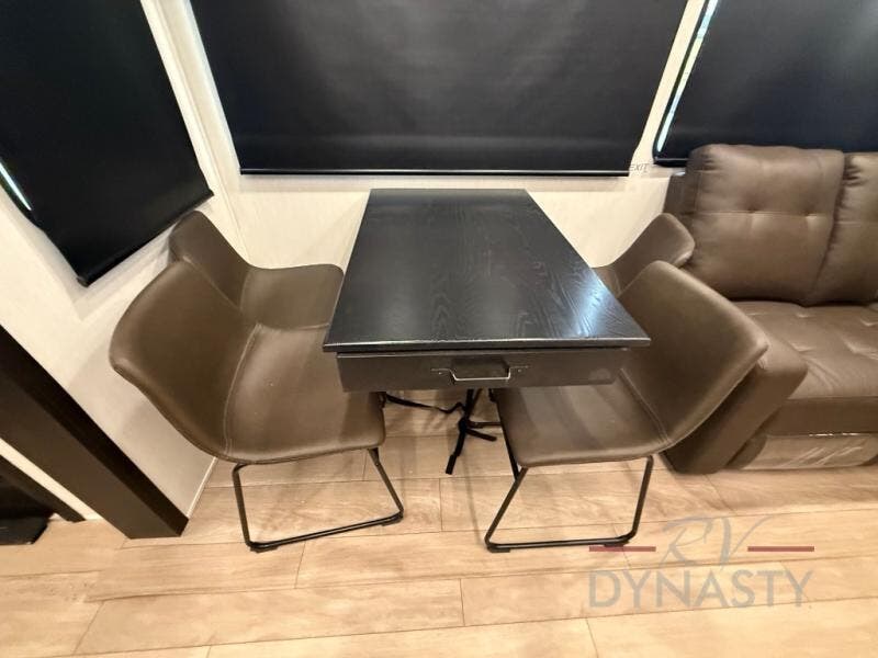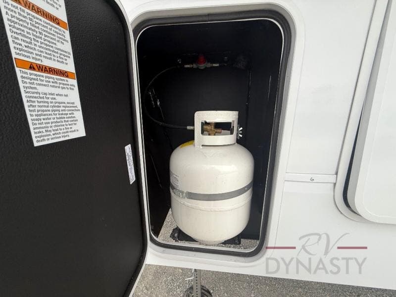 This quad-slide layout is set up for long stays and easy routines. The kitchen centers around a beautiful kitchen island for prep, the free-standing range is perfect for making full-size meals, and clean-up is a breeze with the built-in dishwasher. Across the living/kitchen zone you’ll find seating oriented to the entertainment wall and an LED TV, so movie nights don’t fight the cook space. Up front, the suite’s king bed slide faces a bedroom fireplace, with deep hanging space and drawers to keep wardrobes organized. Outside, the dual entry design improves campsite flow, and the triple-awning coverage stretches usable patio space. There is also more space for kids or guests in the upper loft!