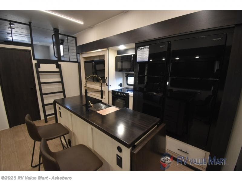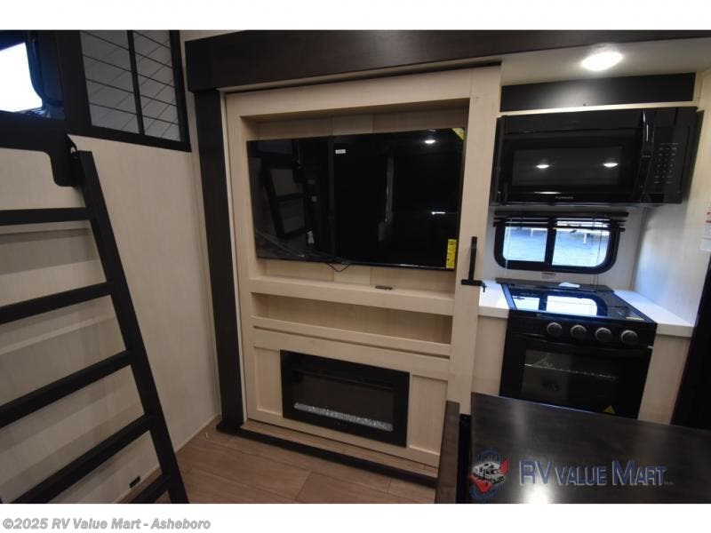 This quad-slide layout is set up for long stays and easy routines. The kitchen centers around a beautiful kitchen island for prep, the free-standing range is perfect for making full-size meals, and clean-up is a breeze with the built-in dishwasher. Across the living/kitchen zone you’ll find seating oriented to the entertainment wall and an LED TV, so movie nights don’t fight the cook space. Up front, the suite’s king bed slide faces a bedroom fireplace, with deep hanging space and drawers to keep wardrobes organized. Outside, the dual entry design improves campsite flow, and the triple-awning coverage stretches usable patio space. There is also more space for kids or guests in the upper loft!