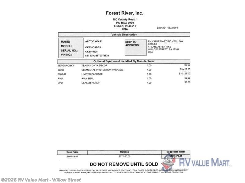Request More Info on this 2026 Forest River Cherokee Arctic Wolf 38DST Offered for sale by RV Value Mart - Willow Street