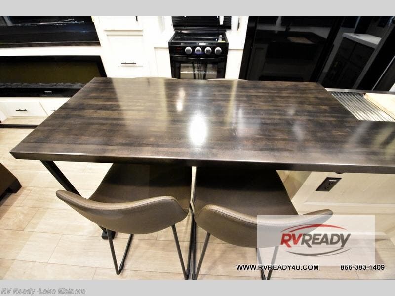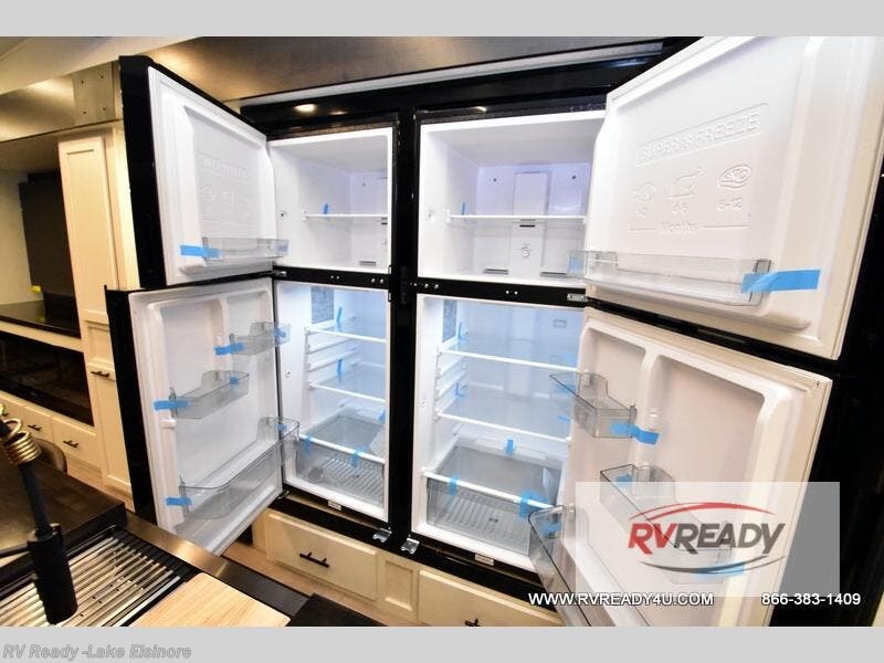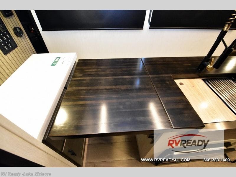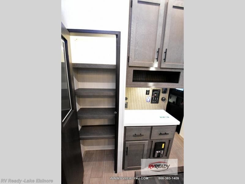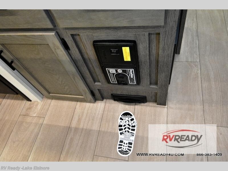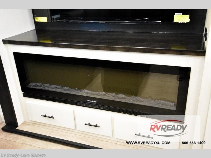 This thoughtfully arranged floorplan is built for extended stays and easy daily living. The rear lounge centers around an L-shaped sectional facing the entertainment wall and fireplace, with a nearby desk for work or hobbies. The kitchen’s island anchors a generous prep area, oversized pantry, and full cooking suite, so meals are simple whether you’re weekending or full-timing. Mid-coach, the guest half bath is convenient for all. Up front, the private bedroom’s king bed slide connects to a spa-style bath with large shower and dressing space, plus a substantial wardrobe to keep clutter out of sight. Outside, enjoy the campsite under dual power awnings that stretch along the patio side.