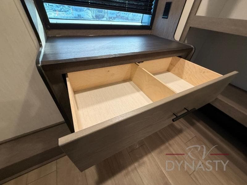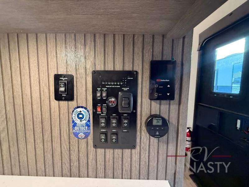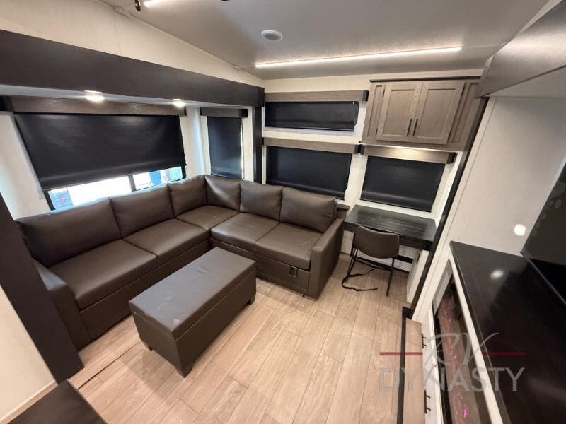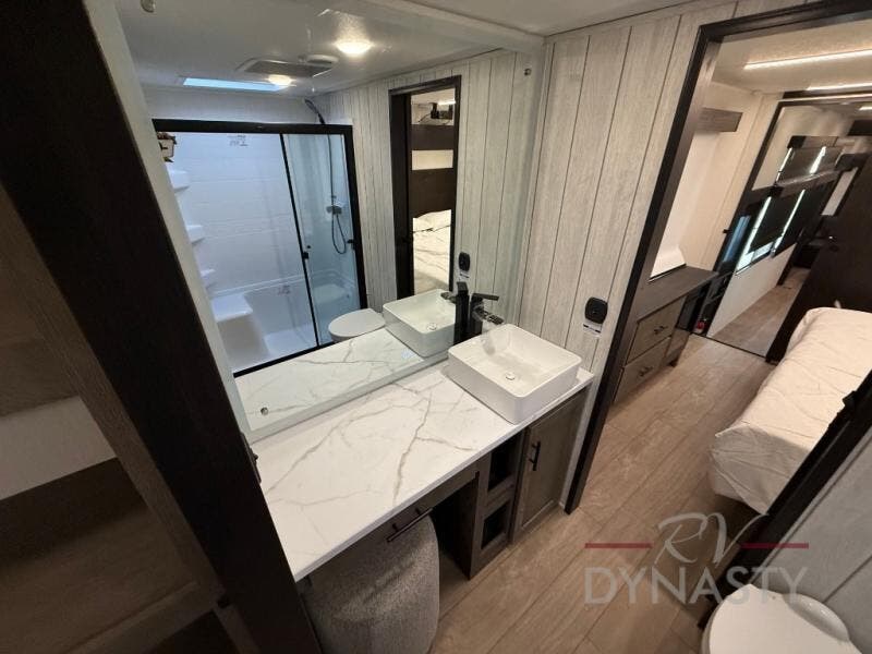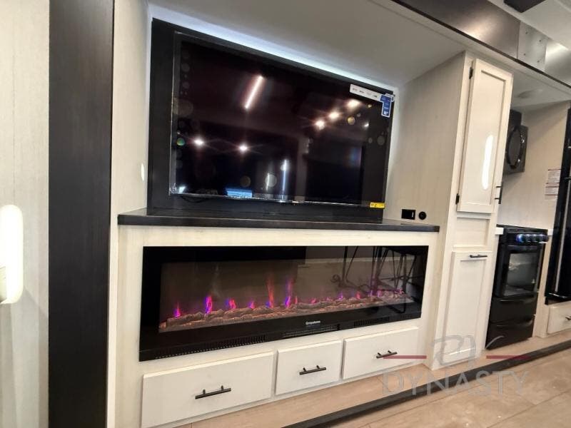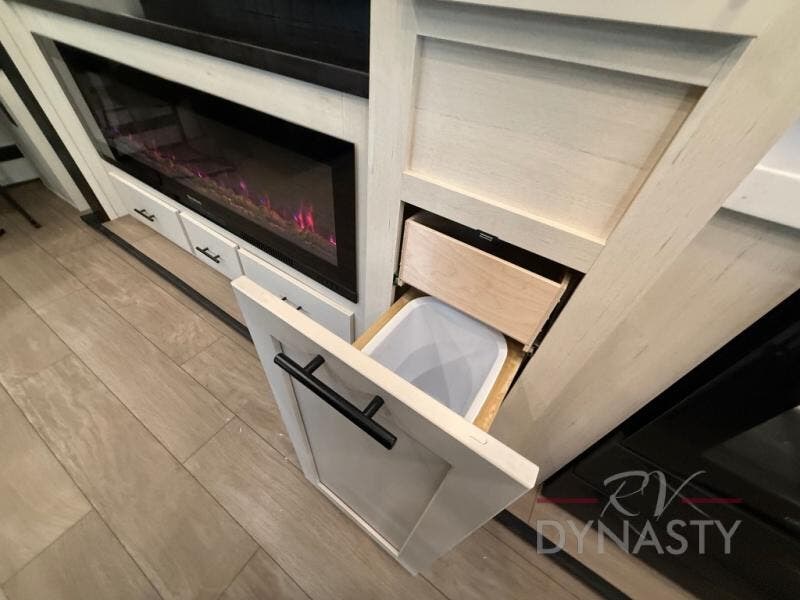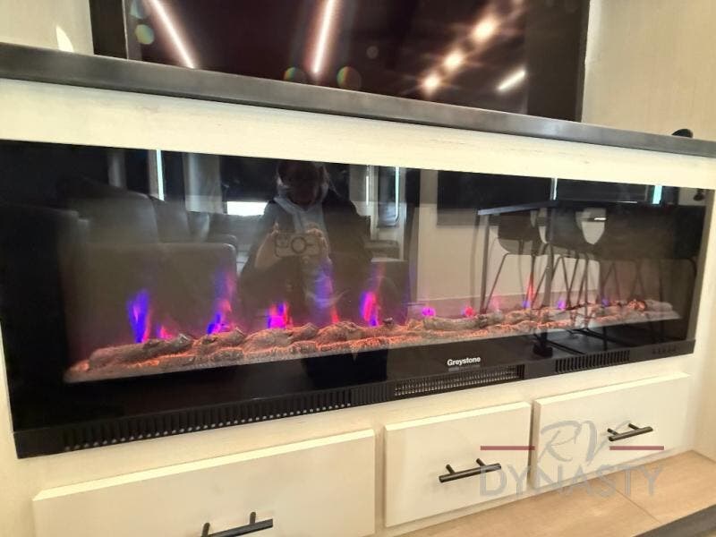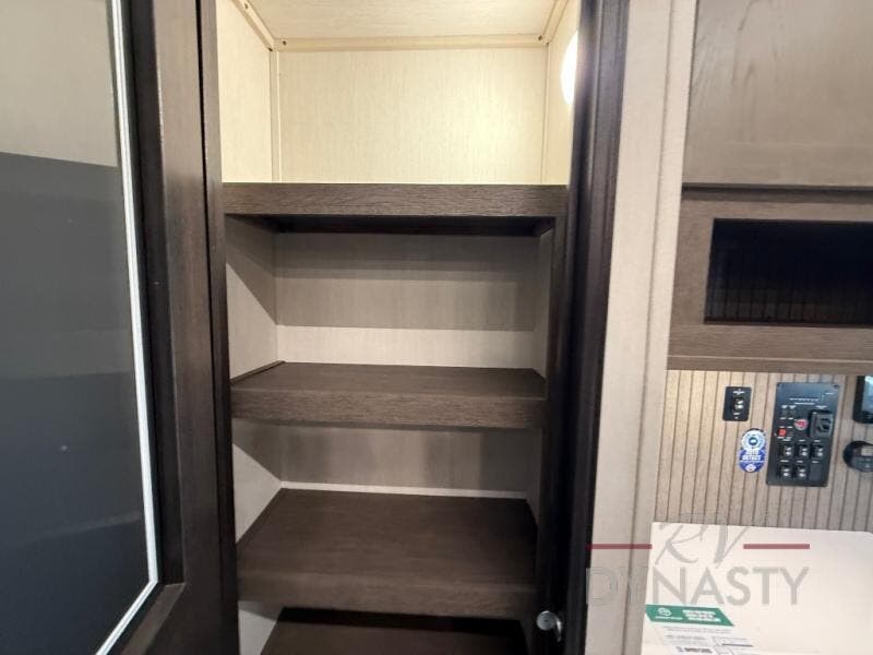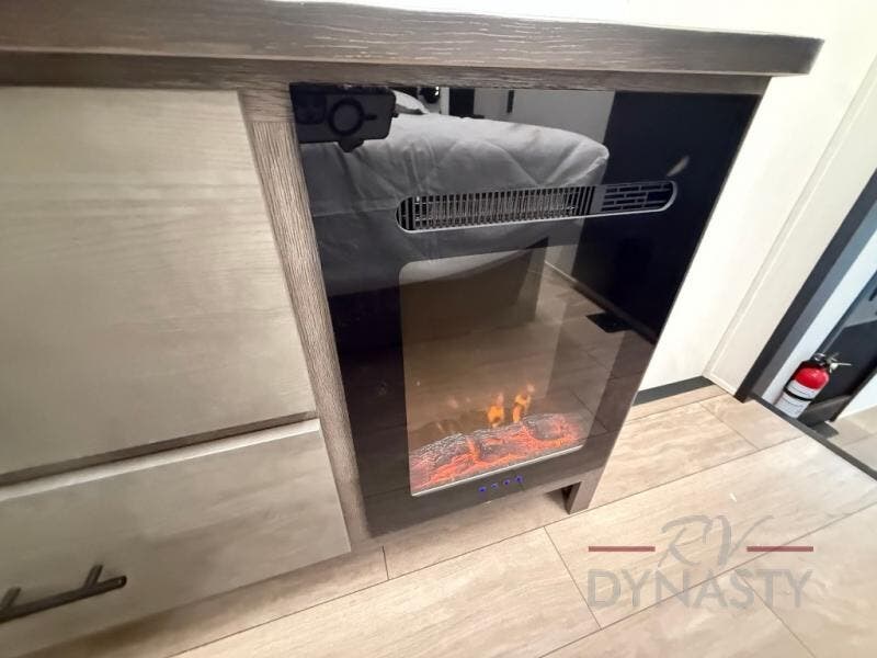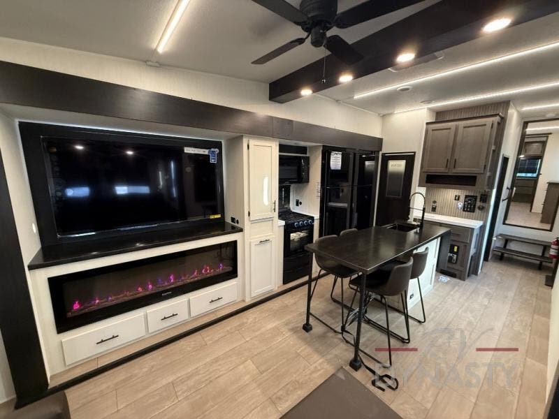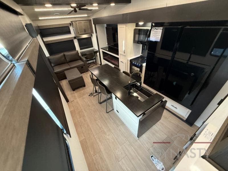 This thoughtfully arranged floorplan is built for extended stays and easy daily living. The rear lounge centers around an L-shaped sectional facing the entertainment wall and fireplace, with a nearby desk for work or hobbies. The kitchen’s island anchors a generous prep area, oversized pantry, and full cooking suite, so meals are simple whether you’re weekending or full-timing. Mid-coach, the guest half bath is convenient for all. Up front, the private bedroom’s king bed slide connects to a spa-style bath with large shower and dressing space, plus a substantial wardrobe to keep clutter out of sight. Outside, enjoy the campsite under dual power awnings that stretch along the patio side.