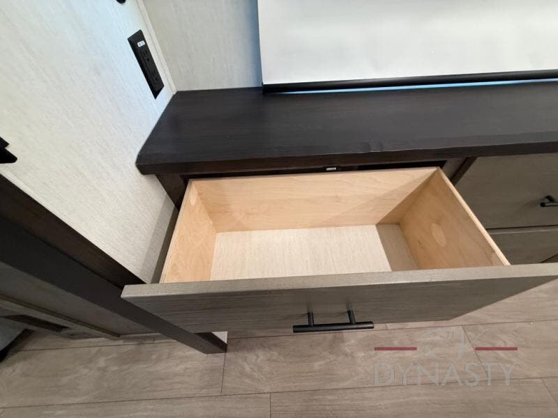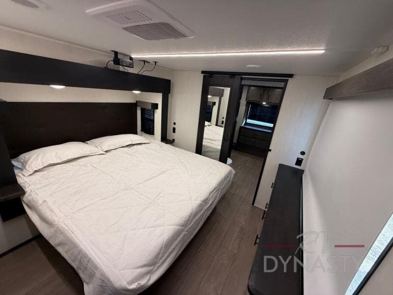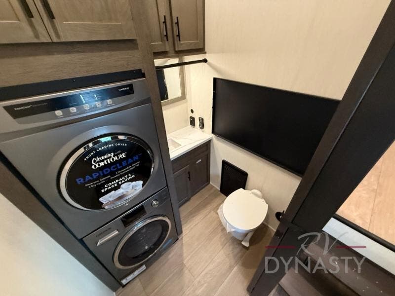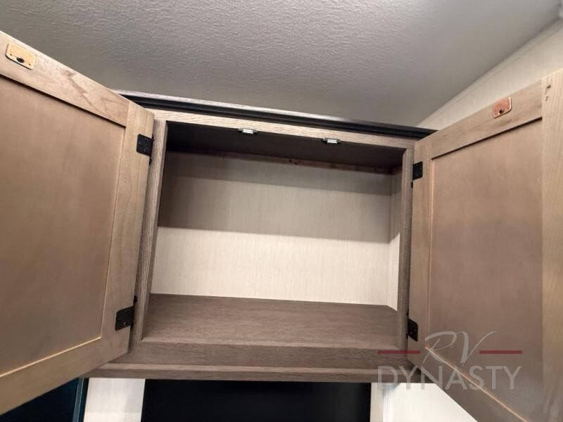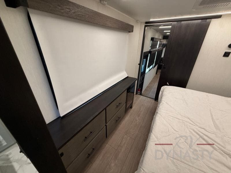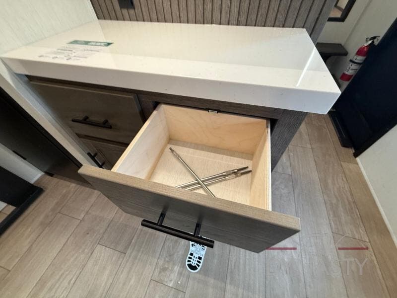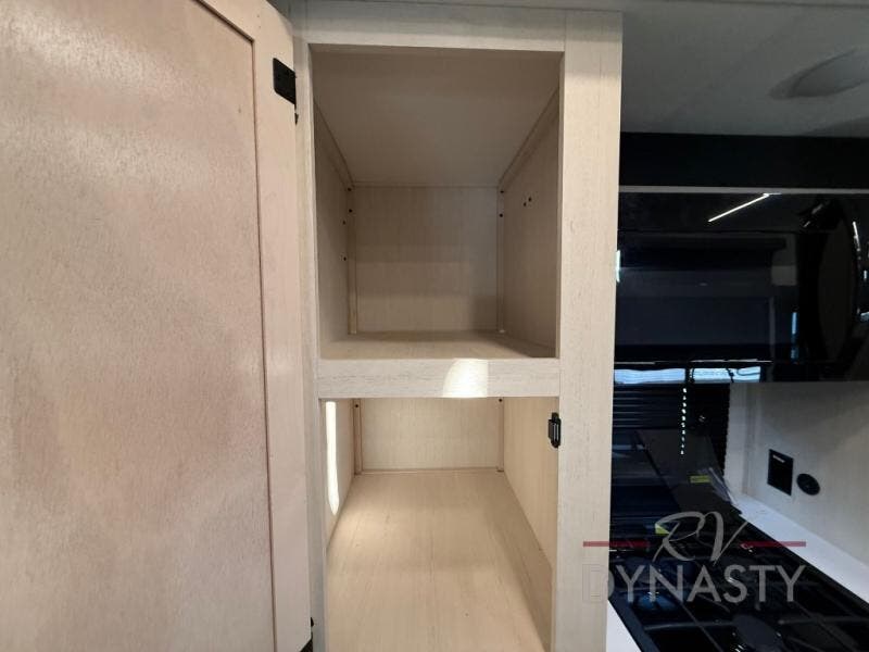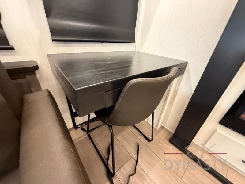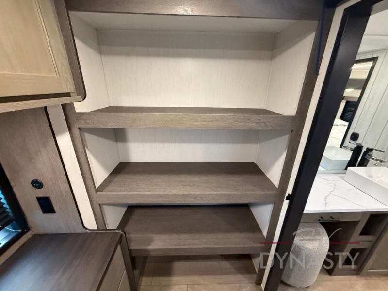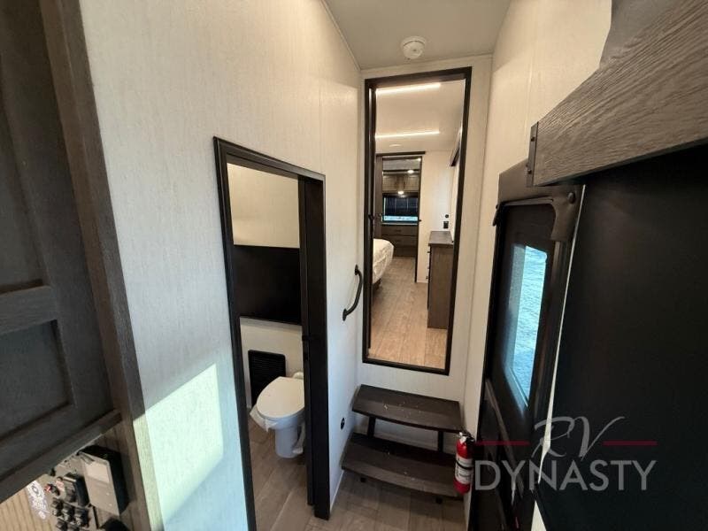 This thoughtfully arranged floorplan is built for extended stays and easy daily living. The rear lounge centers around an L-shaped sectional facing the entertainment wall and fireplace, with a nearby desk for work or hobbies. The kitchen’s island anchors a generous prep area, oversized pantry, and full cooking suite, so meals are simple whether you’re weekending or full-timing. Mid-coach, the guest half bath is convenient for all. Up front, the private bedroom’s king bed slide connects to a spa-style bath with large shower and dressing space, plus a substantial wardrobe to keep clutter out of sight. Outside, enjoy the campsite under dual power awnings that stretch along the patio side.