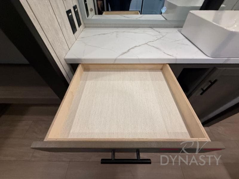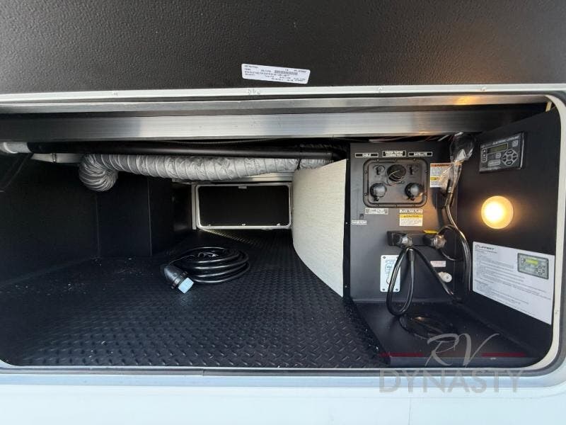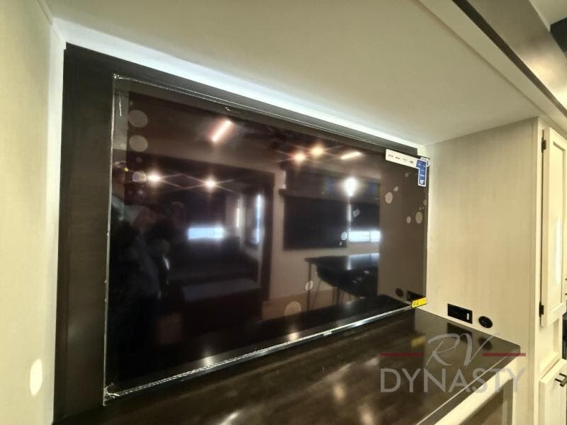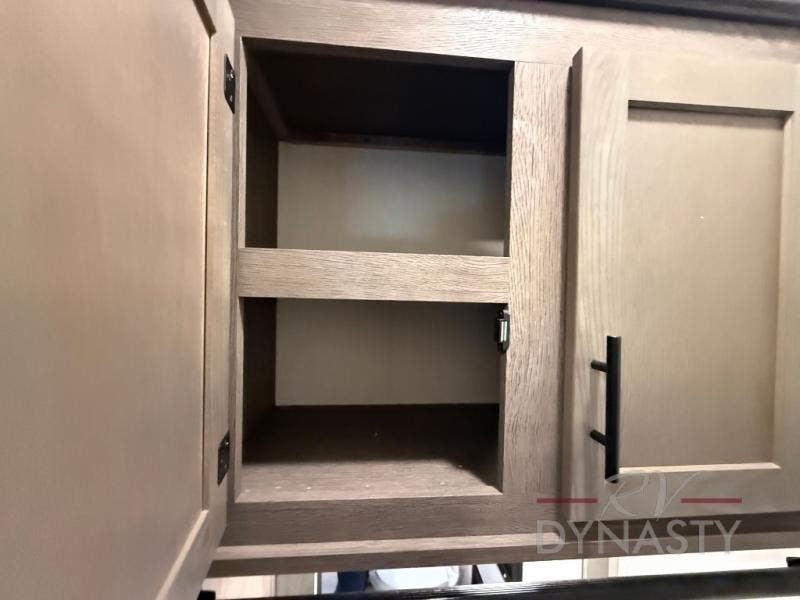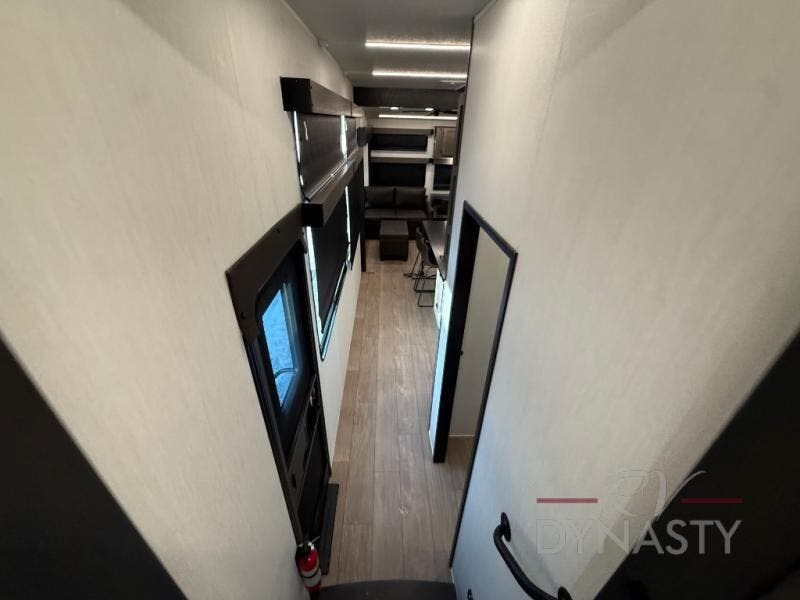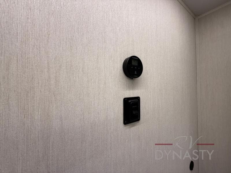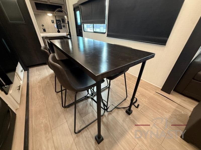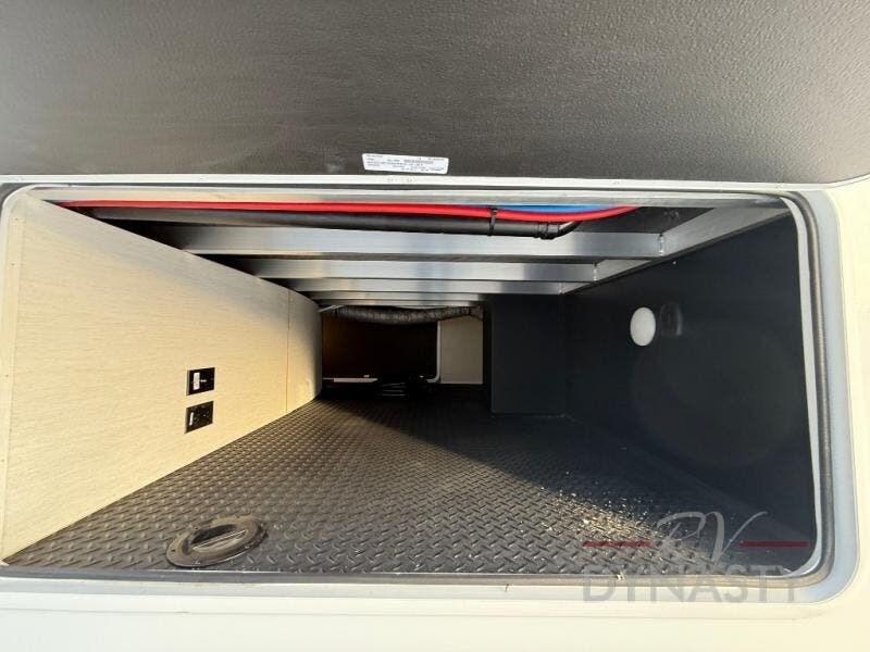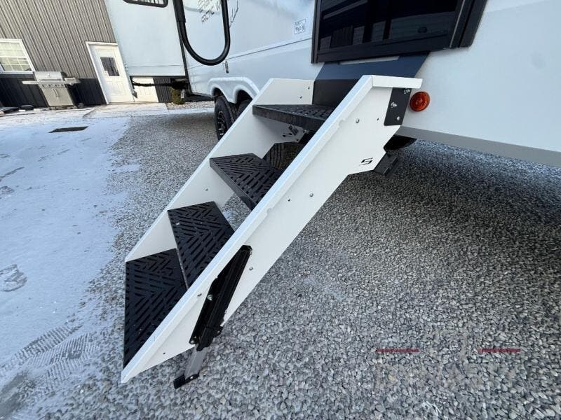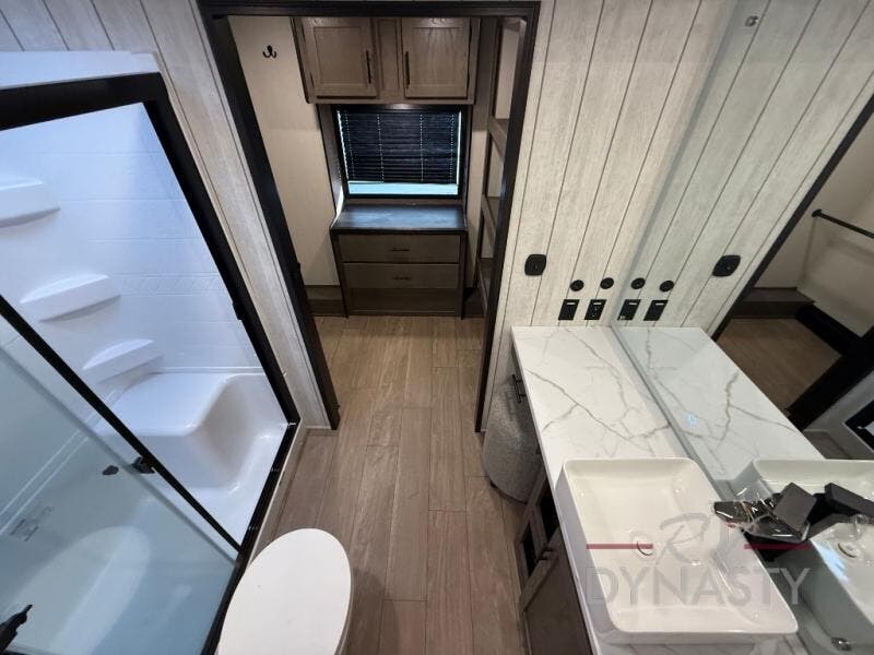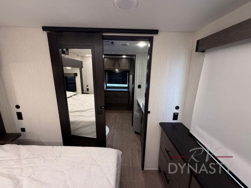 This thoughtfully arranged floorplan is built for extended stays and easy daily living. The rear lounge centers around an L-shaped sectional facing the entertainment wall and fireplace, with a nearby desk for work or hobbies. The kitchen’s island anchors a generous prep area, oversized pantry, and full cooking suite, so meals are simple whether you’re weekending or full-timing. Mid-coach, the guest half bath is convenient for all. Up front, the private bedroom’s king bed slide connects to a spa-style bath with large shower and dressing space, plus a substantial wardrobe to keep clutter out of sight. Outside, enjoy the campsite under dual power awnings that stretch along the patio side.
