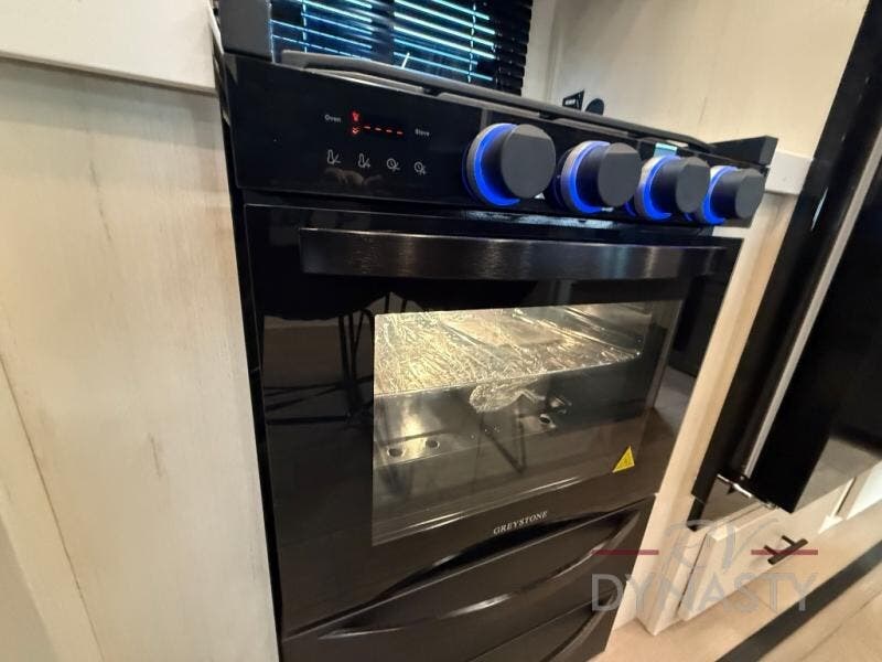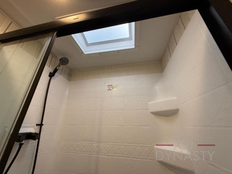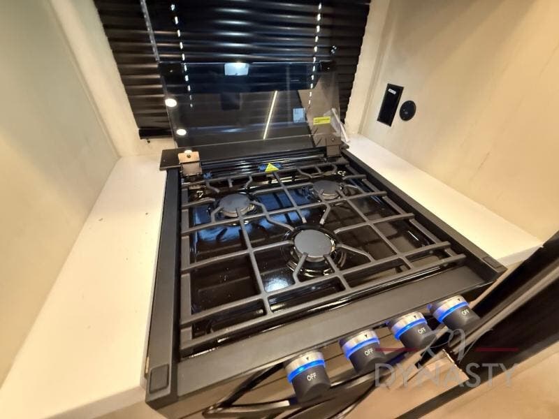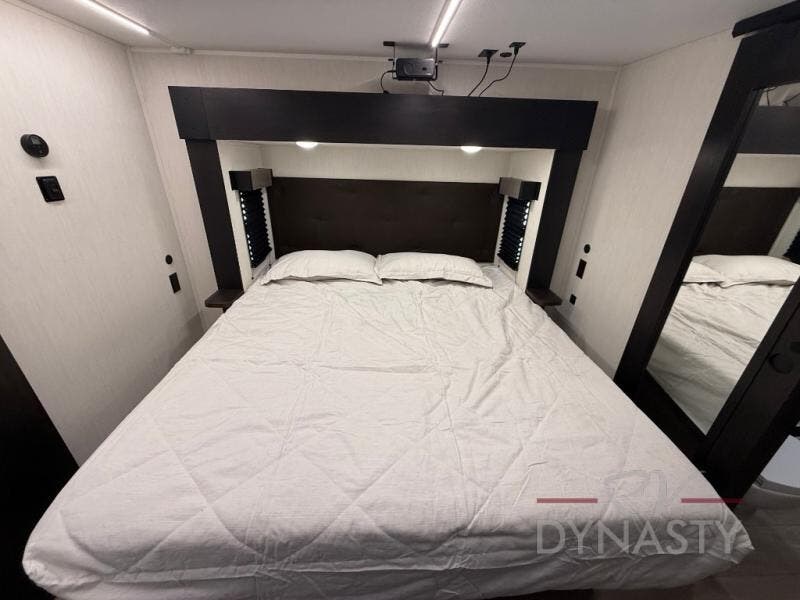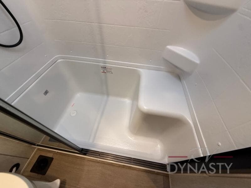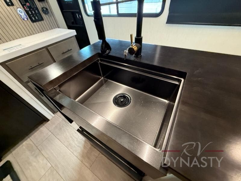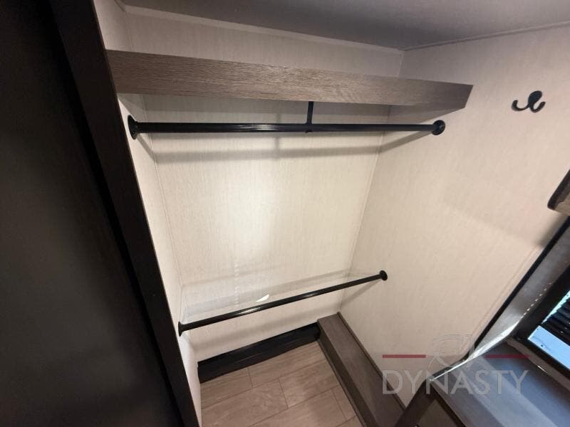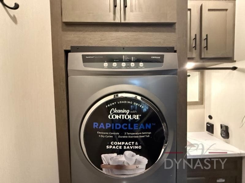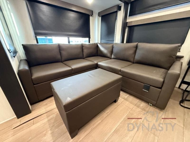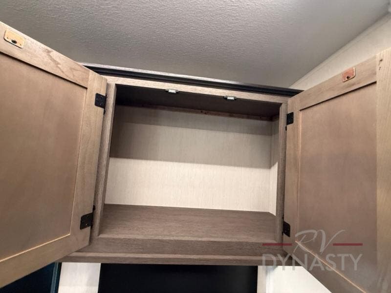 This thoughtfully arranged floorplan is built for extended stays and easy daily living. The rear lounge centers around an L-shaped sectional facing the entertainment wall and fireplace, with a nearby desk for work or hobbies. The kitchen’s island anchors a generous prep area, oversized pantry, and full cooking suite, so meals are simple whether you’re weekending or full-timing. Mid-coach, the guest half bath is convenient for all. Up front, the private bedroom’s king bed slide connects to a spa-style bath with large shower and dressing space, plus a substantial wardrobe to keep clutter out of sight. Outside, enjoy the campsite under dual power awnings that stretch along the patio side.