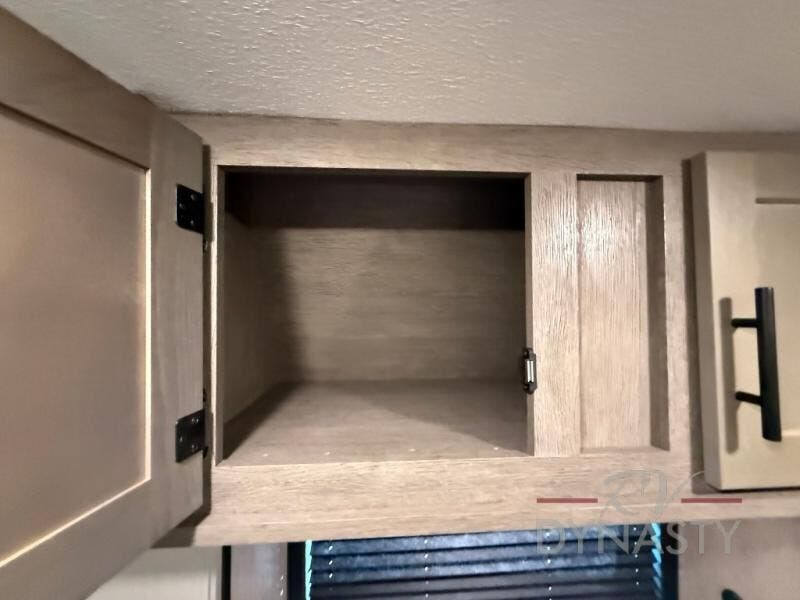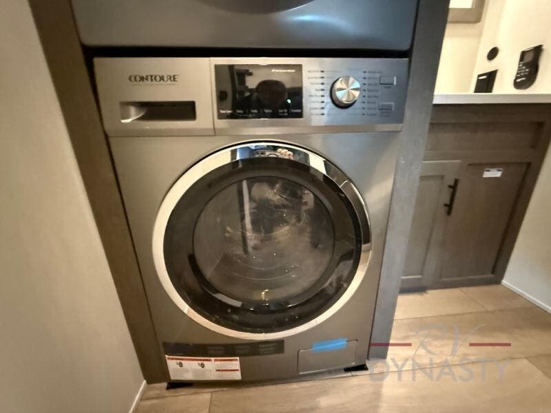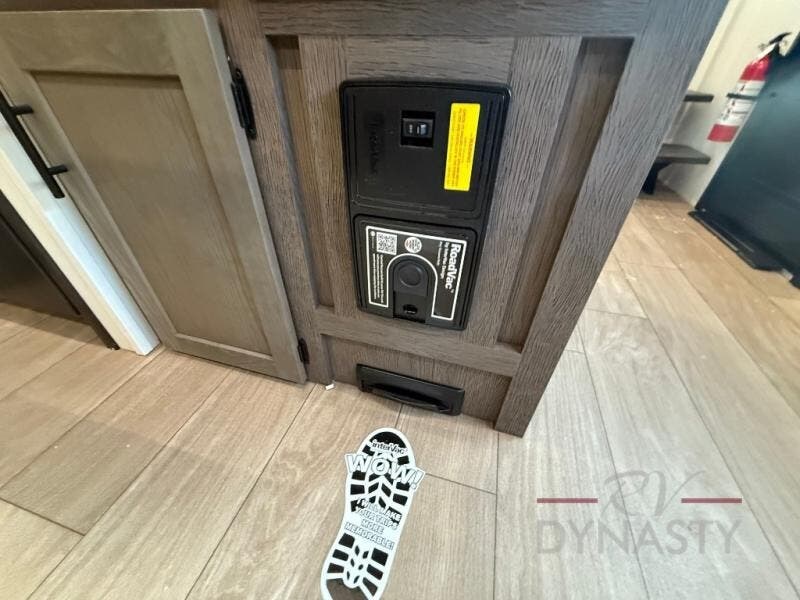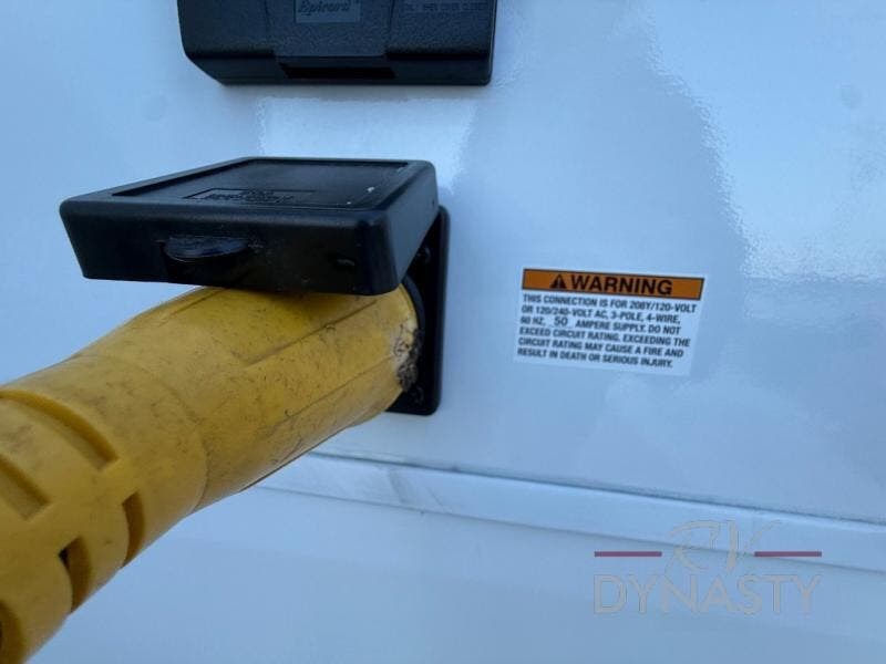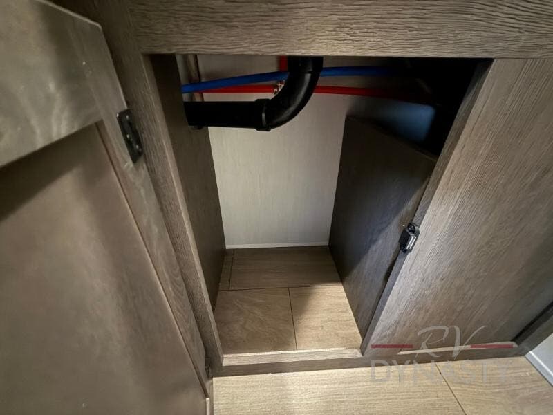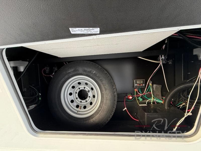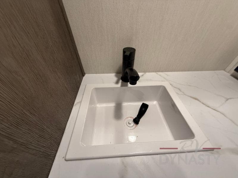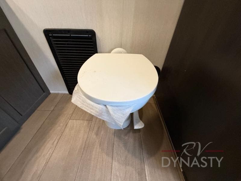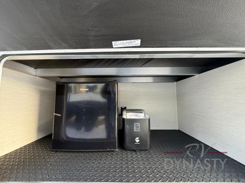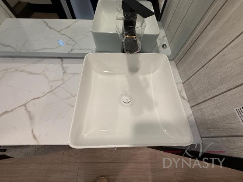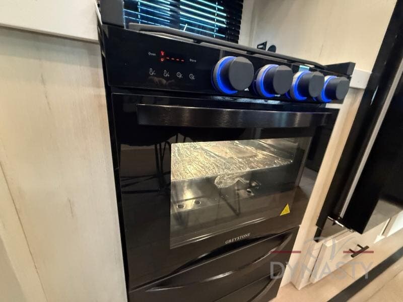 This thoughtfully arranged floorplan is built for extended stays and easy daily living. The rear lounge centers around an L-shaped sectional facing the entertainment wall and fireplace, with a nearby desk for work or hobbies. The kitchen’s island anchors a generous prep area, oversized pantry, and full cooking suite, so meals are simple whether you’re weekending or full-timing. Mid-coach, the guest half bath is convenient for all. Up front, the private bedroom’s king bed slide connects to a spa-style bath with large shower and dressing space, plus a substantial wardrobe to keep clutter out of sight. Outside, enjoy the campsite under dual power awnings that stretch along the patio side.