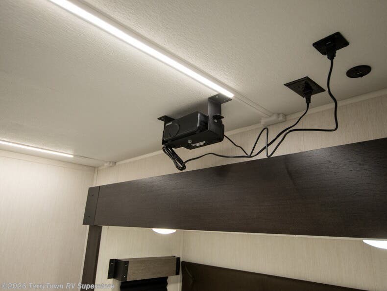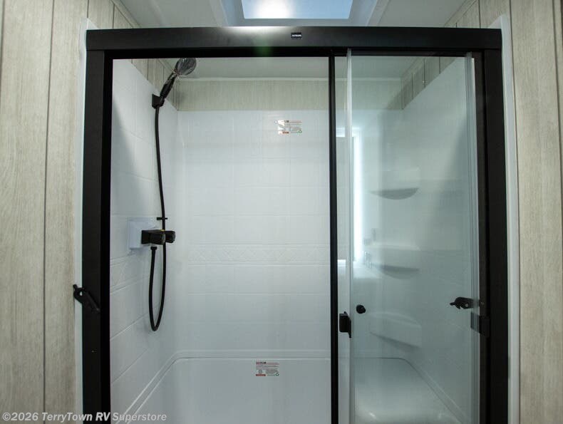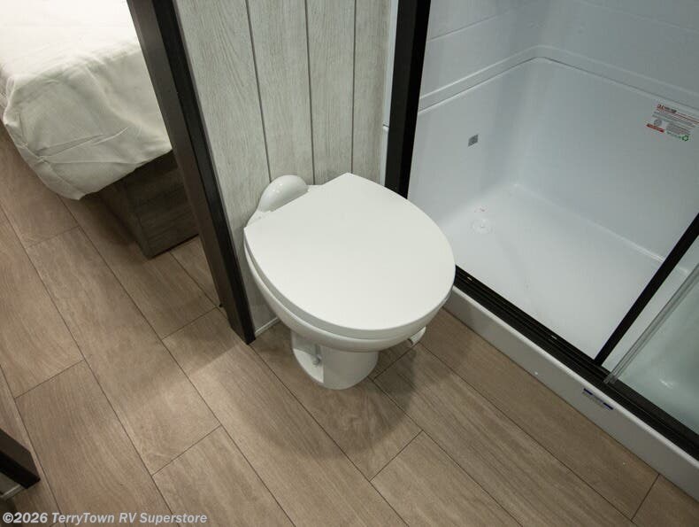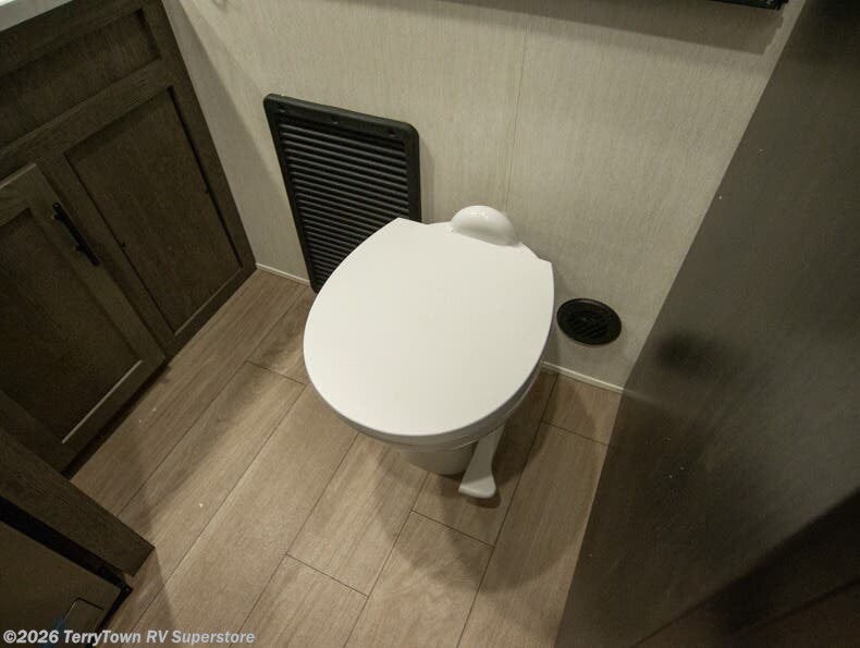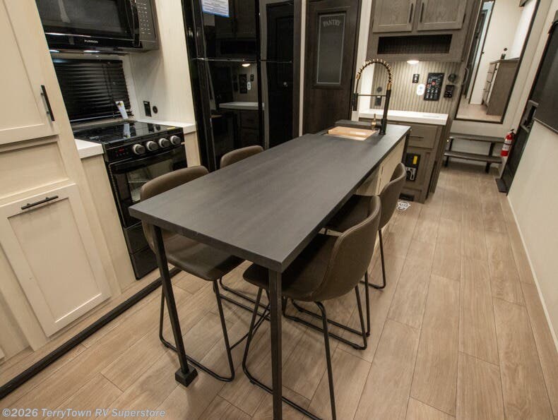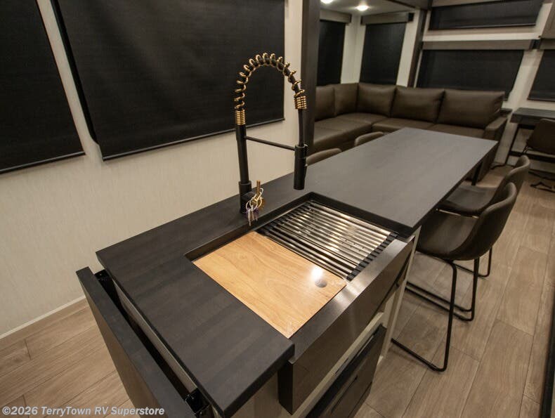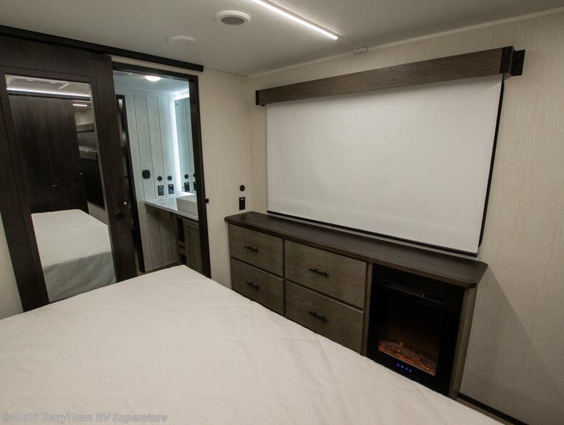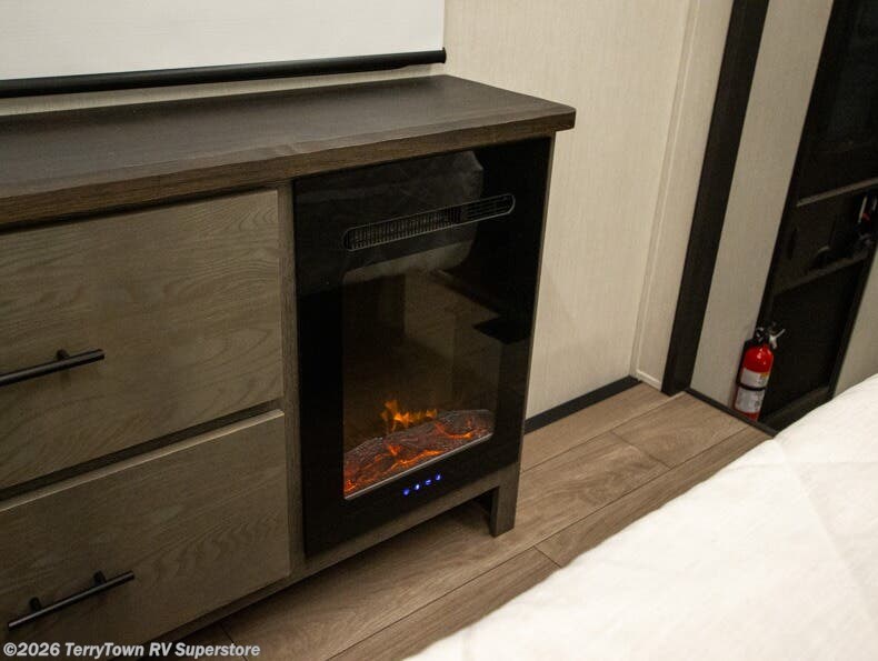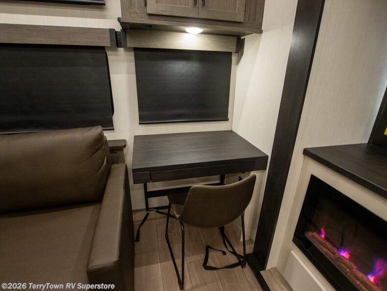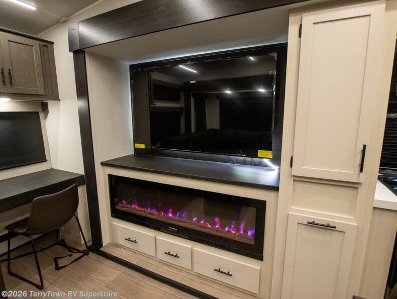 This thoughtfully arranged floorplan is built for extended stays and easy daily living. The rear lounge centers around an L-shaped sectional facing the entertainment wall and fireplace, with a nearby desk for work or hobbies. The kitchen’s island anchors a generous prep area, oversized pantry, and full cooking suite, so meals are simple whether you’re weekending or full-timing. Mid-coach, the guest half bath is convenient for all. Up front, the private bedroom’s king bed slide connects to a spa-style bath with large shower and dressing space, plus a substantial wardrobe to keep clutter out of sight. Outside, enjoy the campsite under dual power awnings that stretch along the patio side.