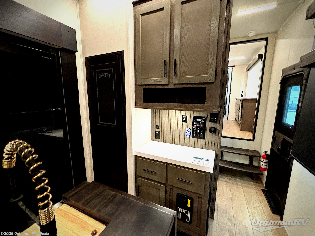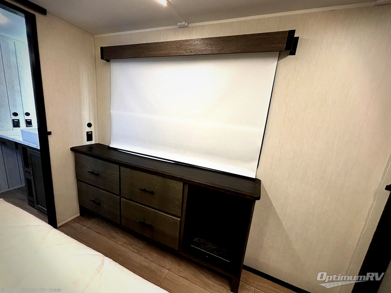 This thoughtfully arranged floorplan is built for extended stays and easy daily living. The rear lounge centers around an L-shaped sectional facing the entertainment wall and fireplace, with a nearby desk for work or hobbies. The kitchen’s island anchors a generous prep area, oversized pantry, and full cooking suite, so meals are simple whether you’re weekending or full-timing. Mid-coach, the guest half bath is convenient for all. Up front, the private bedroom’s king bed slide connects to a spa-style bath with large shower and dressing space, plus a substantial wardrobe to keep clutter out of sight. Outside, enjoy the campsite under dual power awnings that stretch along the patio side.
