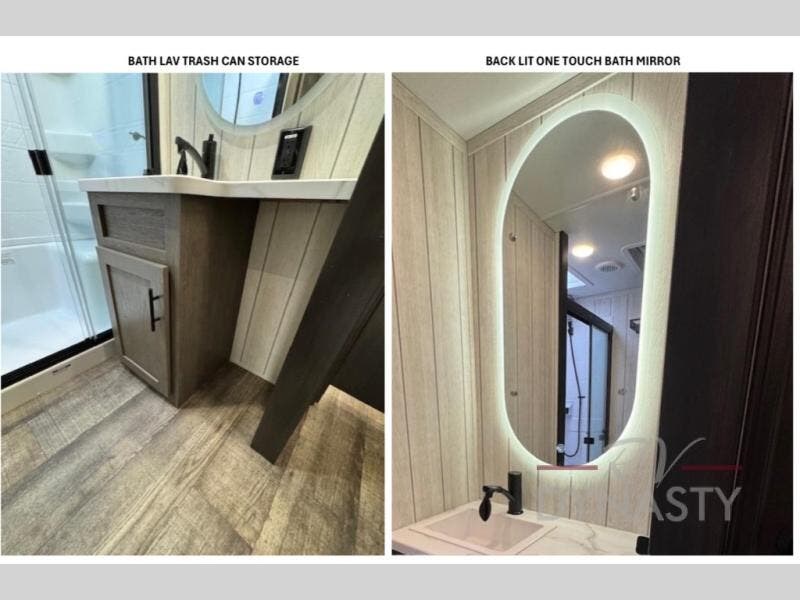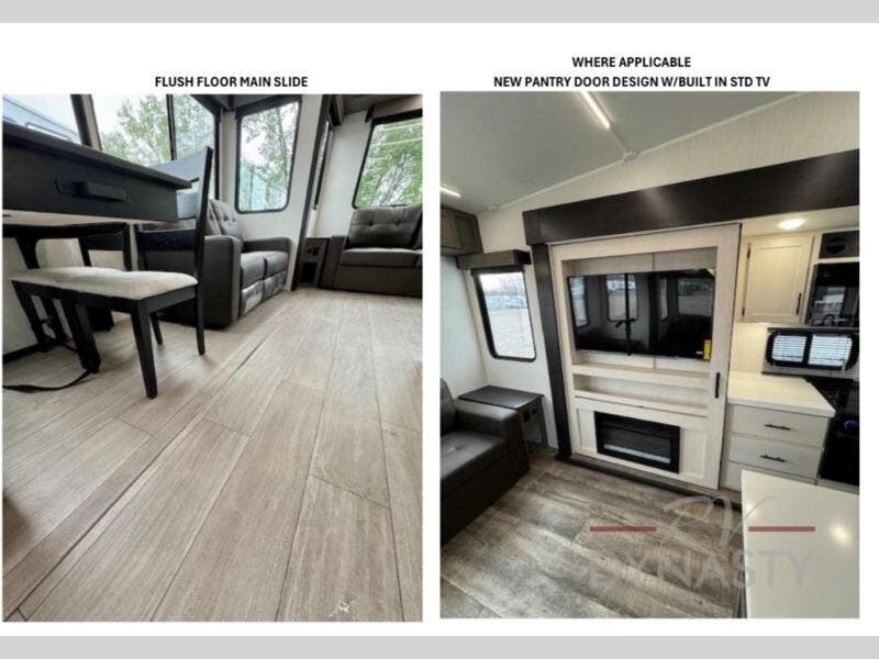 Five slides, a bath and a half, plus sleeping space for six make this fifth wheel the perfect choice! Once you arrive at your destination, prepare lunch on the exterior kitchen. Inside, you'll find a kitchen island, plenty of storage space, plus a free-standing table with chairs and a storage ottoman seat. The front living area will be a favorite place to hang out and this room can double as a bedroom with the two tri-fold sofas. There is also theater seating across from the entertainment center and fireplace, plus storage cabinets for movies or board games. When you're ready to call it a night, head to the master bedroom for a great night's rest on the king bed slide out. You will also love the full rear bath with dual sinks, a spacious shower, plus a closet with stackable washer and dryer prep!