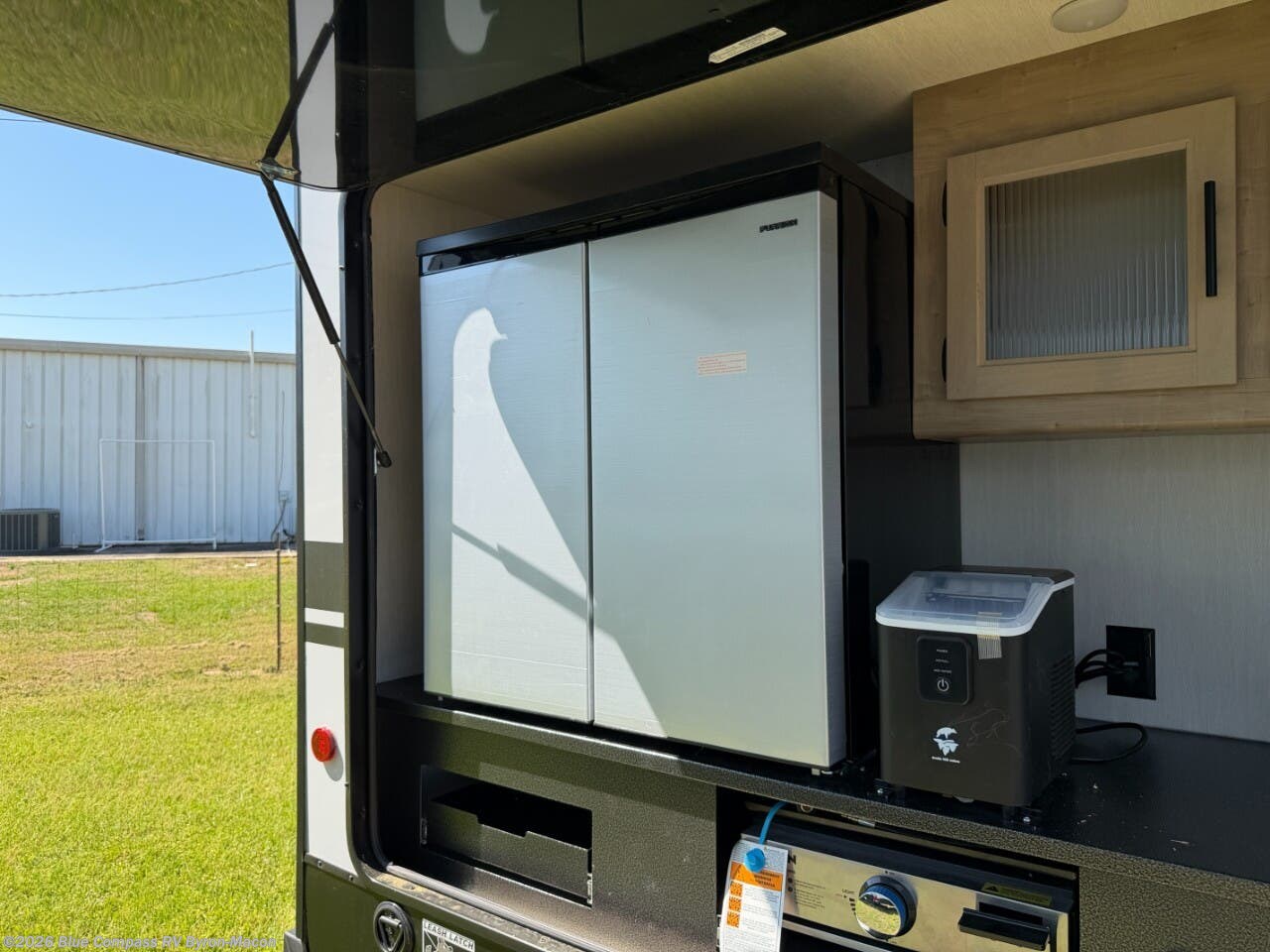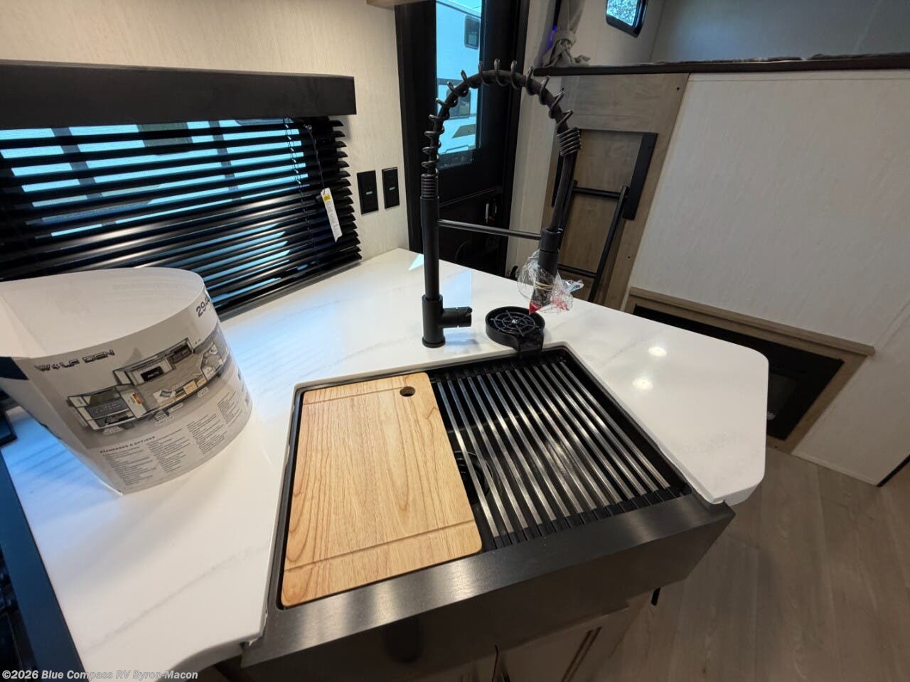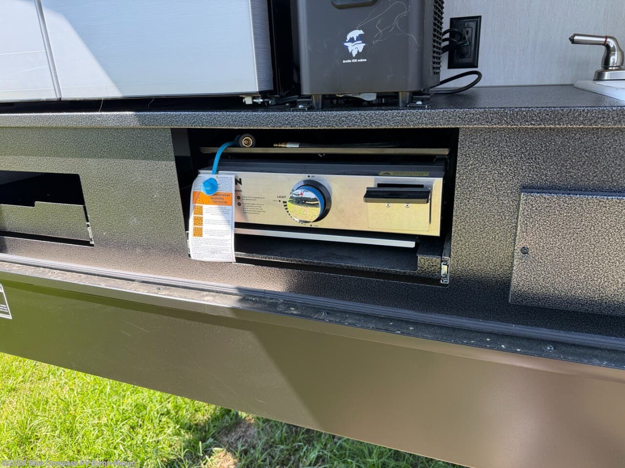 How does having a master bedroom for yourself and a private bunkhouse for your guests sound? This innovated design gives everyone their own space at night with a full queen loft bed, a 36" bunk bed and a walk-around queen bed, plus the U-shaped dinette and sofa provide more sleeping space. Everyone will enjoy the fireplace on chilly nights and the cook will love all the kitchen appliances including the large pantry and farm sink. The outdoor bar and grill with a 5.6 cu. ft. refrigerator and a pull-out cooktop, a sink and large storage areas are a must have when you love to be outside.