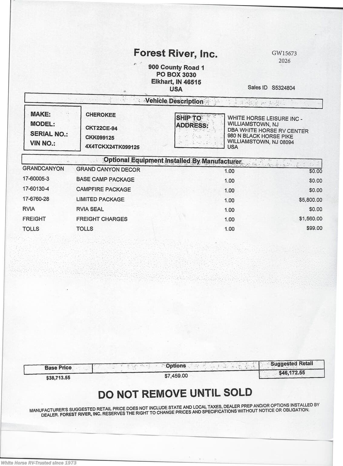 This Forest River Cherokee Grey Wolf 22CE (Stock #GW15673) includes the Base Camp Package, Campfire Package, Limited Package, & Interior Décor Grand Canyon. MSRP $46,172.55.