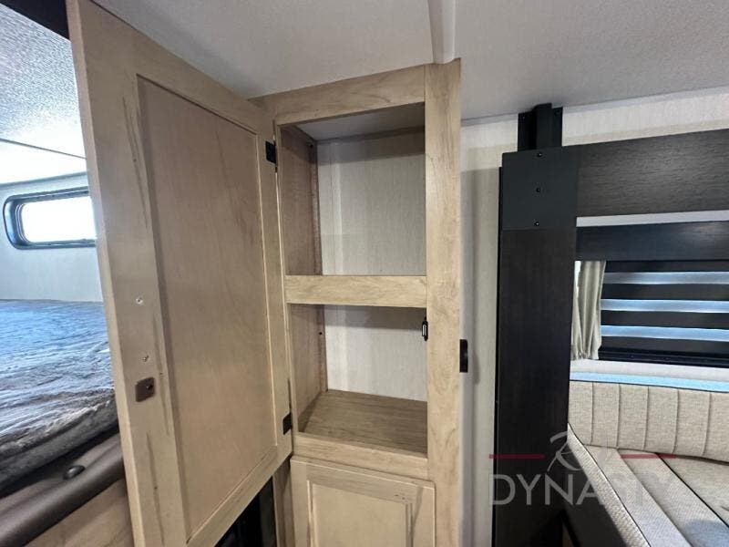 You will love the space provided in this dual entry Cherokee Grey Wolf travel trailer that has double-size bunks! The rear entry door leads right into the full bath allowing easy access from outside when you need to use the bathroom while you're enjoying the great outdoors. The large U-shaped dinette slide will not only seat everyone comfortably for a meal or a game, but since it also slides out, it opens up the interior even more to give you plenty of space for foot traffic. For all of your outdoor gear, you will find the outside storage compartments handy for stowing away your things when not in use. While the kids enjoy their bunk beds, you will enjoy a good night's rest in your RV king bed with wardrobes on either side up in the front private bedroom!