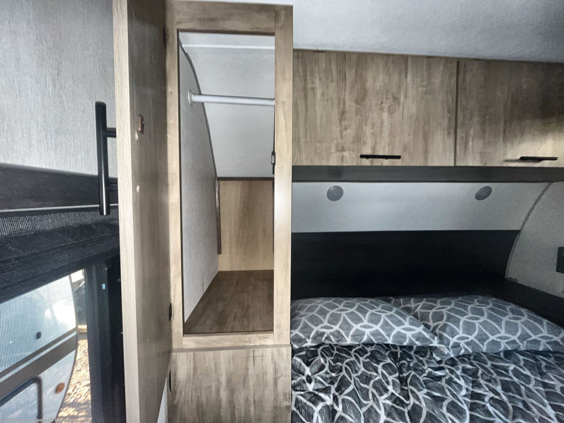 You will love the space provided in this dual entry Cherokee Grey Wolf travel trailer that has double-size bunks! The rear entry door leads right into the full bath allowing easy access from outside when you need to use the bathroom while you're enjoying the great outdoors. The large U-shaped dinette slide will not only seat everyone comfortably for a meal or a game, but since it also slides out, it opens up the interior even more to give you plenty of space for foot traffic. For all of your outdoor gear, you will find the outside storage compartments handy for stowing away your things when not in use. While the kids enjoy their bunk beds, you will enjoy a good night's rest in your RV king bed with wardrobes on either side up in the front private bedroom!