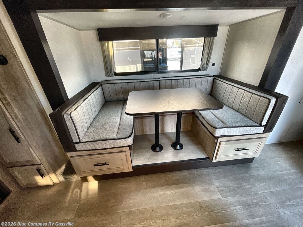 You will love the space provided in this dual entry Cherokee Grey Wolf travel trailer that has double-size bunks! The rear entry door leads right into the full bath allowing easy access from outside when you need to use the bathroom while you're enjoying the great outdoors. The large U-shaped dinette slide will not only seat everyone comfortably for a meal or a game, but since it also slides out, it opens up the interior even more to give you plenty of space for foot traffic. For all of your outdoor gear, you will find the outside storage compartments handy for stowing away your things when not in use. While the kids enjoy their bunk beds, you will enjoy a good night's rest in your RV king bed with wardrobes on either side up in the front private bedroom!