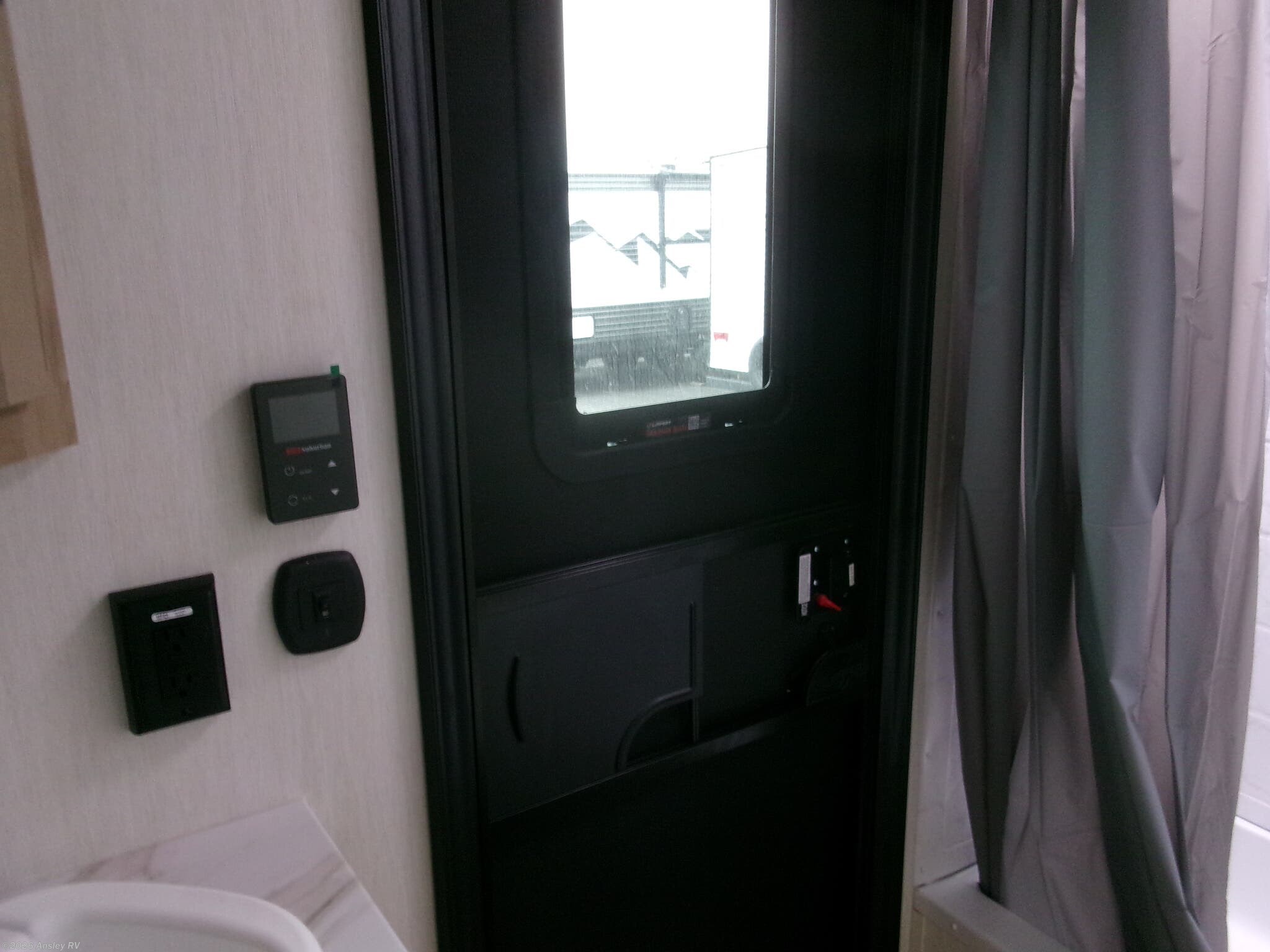 - Real Blackout Glass, Safety Slam, Friction Hinge Entry Door with Window and Shade Prep