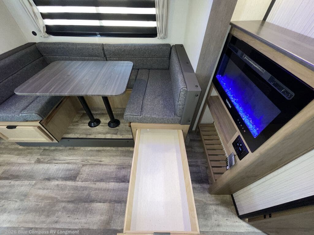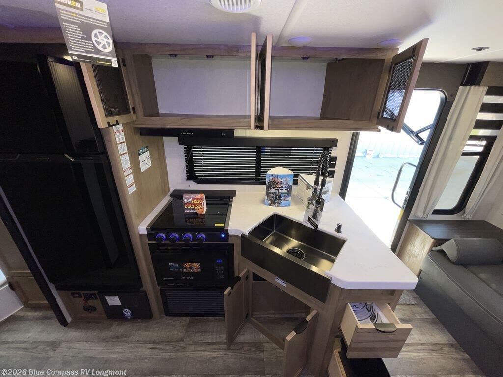 This Cherokee Grey Wolf travel trailer is perfect for your small family and will leave you planning your next outing before you are back from your current trip! You will find all of the comforts you need with plenty of livable space including a U-shaped dinette slide. There is also a sofa for more seating when company arrives, and there are end tables on either side to prevent spills. You also have the kitchen equipped with an air fryer and a 12V refrigerator for you to whip un a delicious meal. A spacious walk-through bath leads to a front private bedroom where you will enjoy a great night's rest on a comfortable RV king bed. You will find ample storage for clothing in the wardrobes that are above handy nightstands for your personal things.