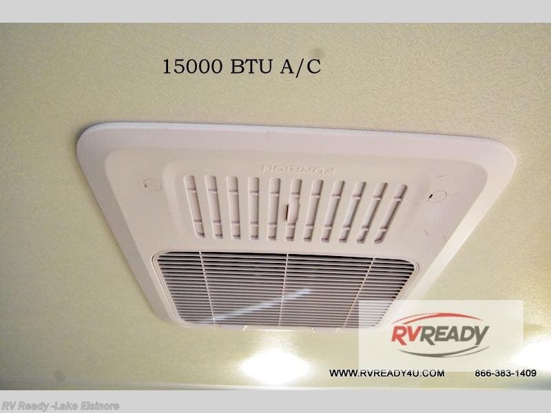 Enjoy time at the campground in this spacious travel trailer with a front private bedroom and double-size bunks for guests! The full interior kitchen and outside kitchen will let you make meals each day, and everyone can dine around the U-shaped dinette or under the 15' awning outside! This unit also includes ample storage space, including hidden shelves behind the fireplace and outside storage!