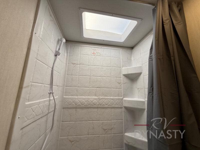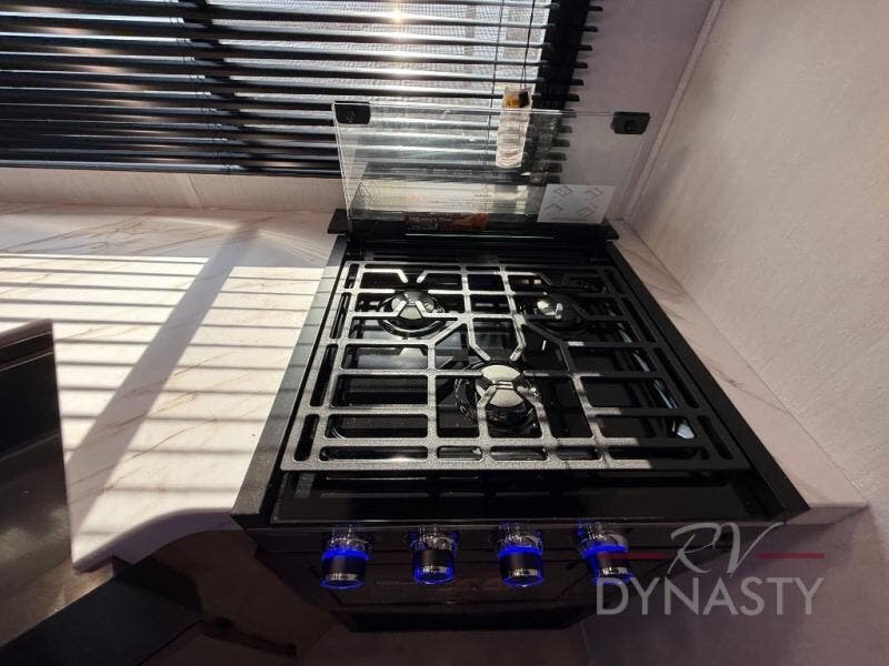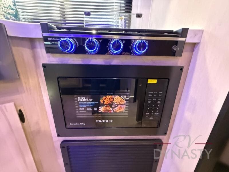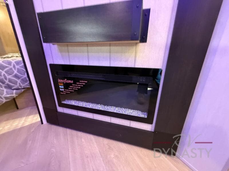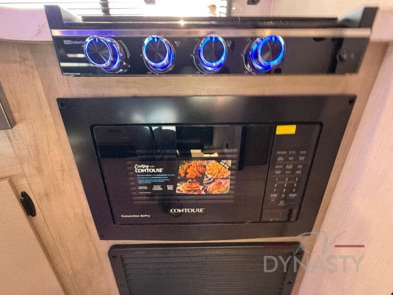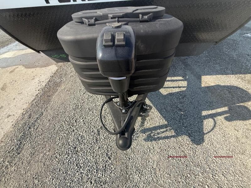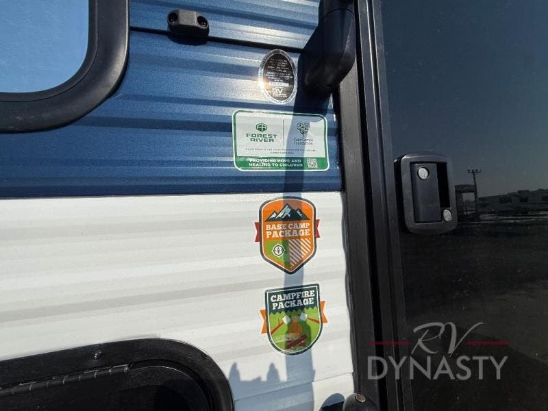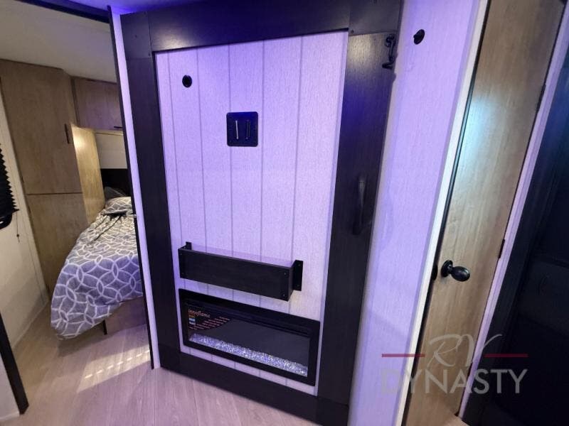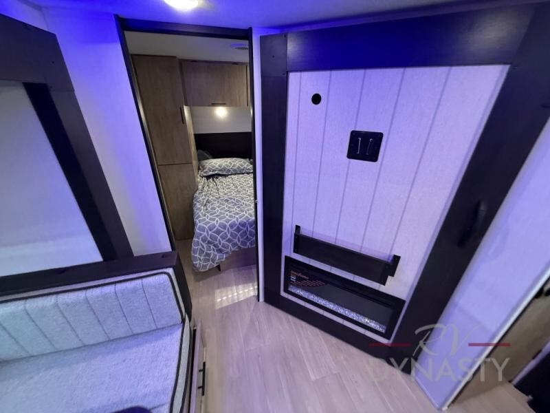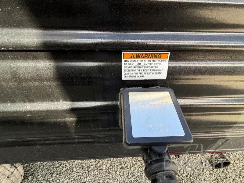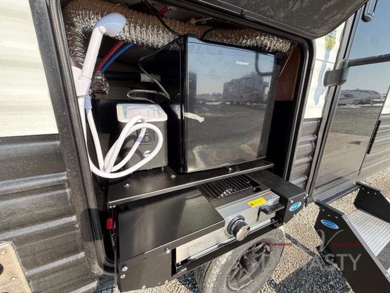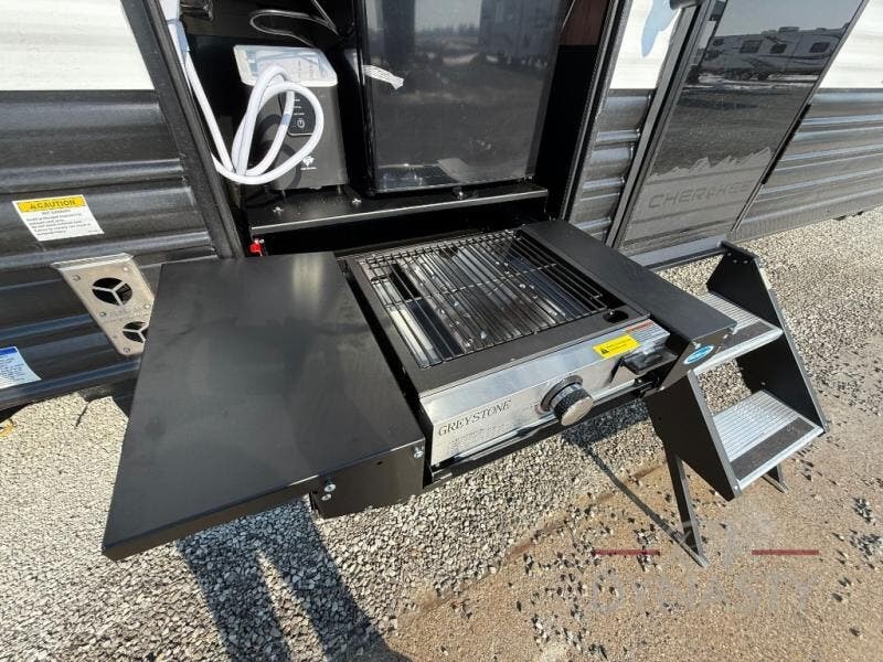 Enjoy time at the campground in this spacious travel trailer with a front private bedroom and double-size bunks for guests! The full interior kitchen and outside kitchen will let you make meals each day, and everyone can dine around the U-shaped dinette or under the 15' awning outside! This unit also includes ample storage space, including hidden shelves behind the fireplace and outside storage!