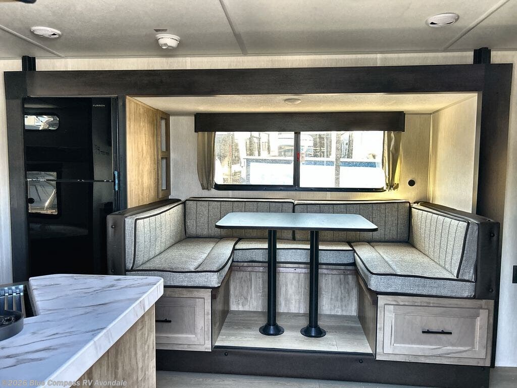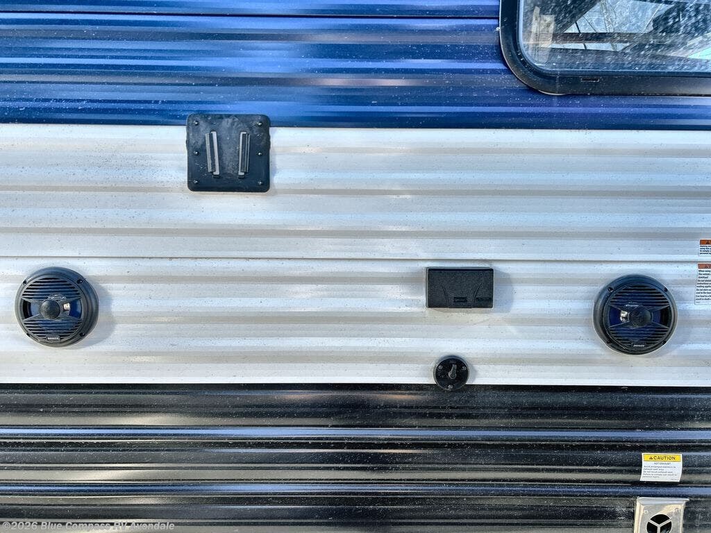 Enjoy time at the campground in this spacious travel trailer with a front private bedroom and double-size bunks for guests! The full interior kitchen and outside kitchen will let you make meals each day, and everyone can dine around the U-shaped dinette or under the 15' awning outside! This unit also includes ample storage space, including hidden shelves behind the fireplace and outside storage!