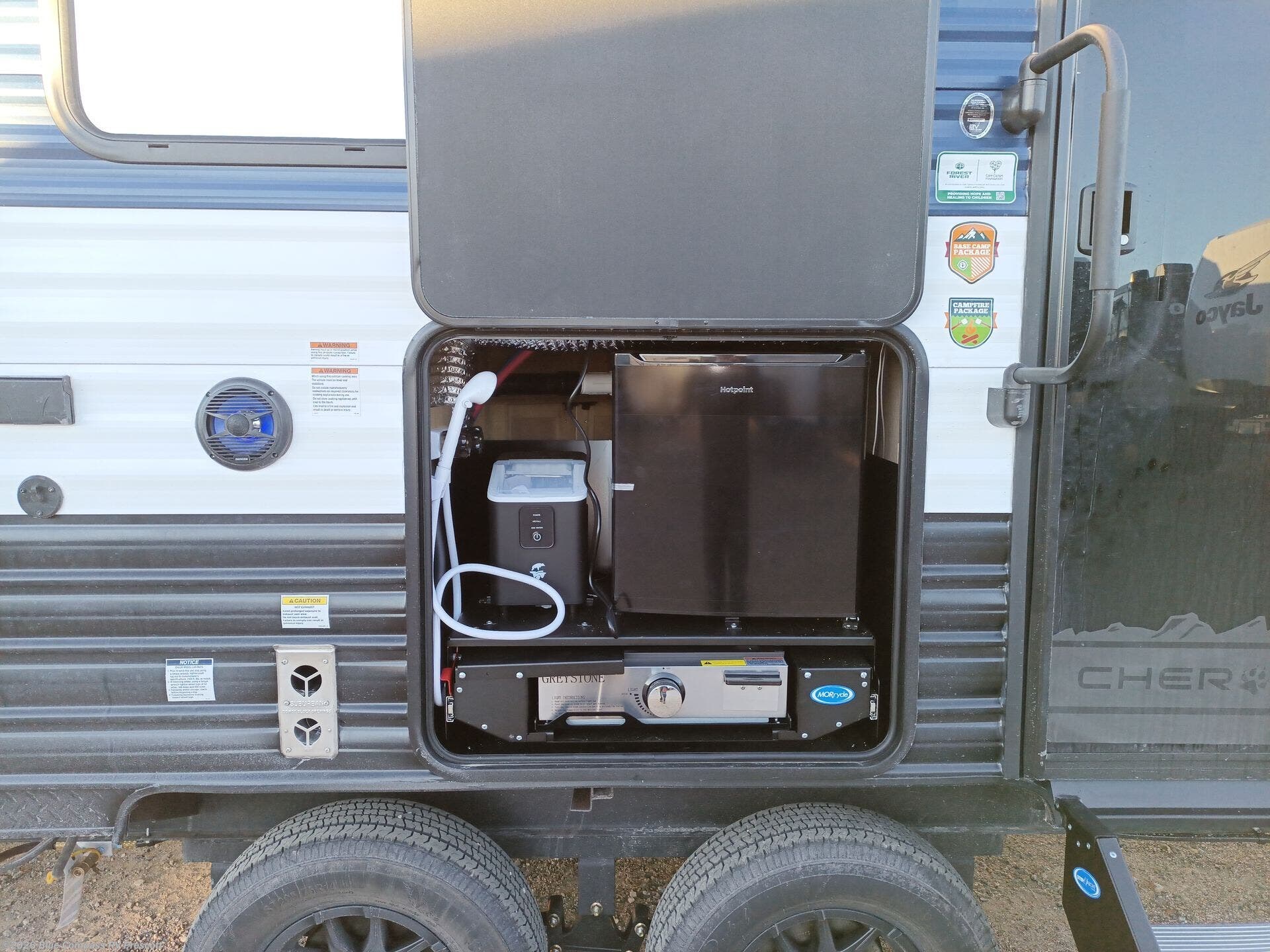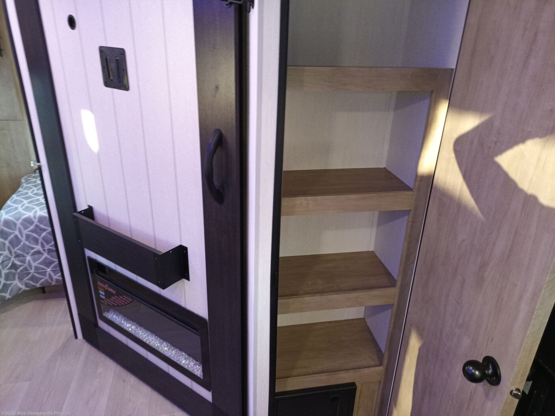 Enjoy time at the campground in this spacious travel trailer with a front private bedroom and double-size bunks for guests! The full interior kitchen and outside kitchen will let you make meals each day, and everyone can dine around the U-shaped dinette or under the 15' awning outside! This unit also includes ample storage space, including hidden shelves behind the fireplace and outside storage!