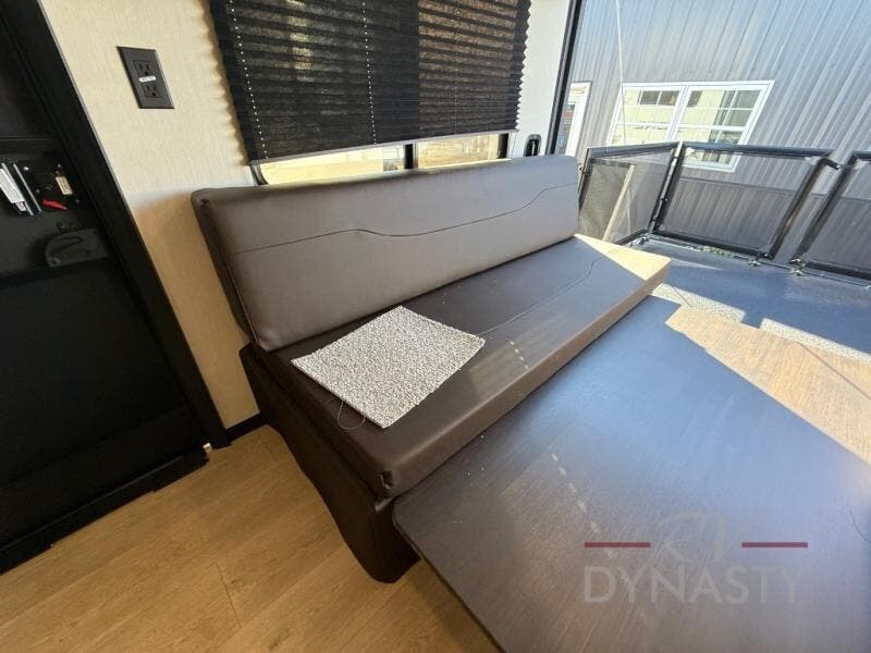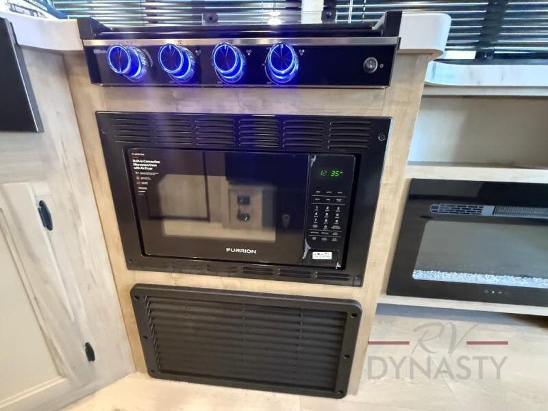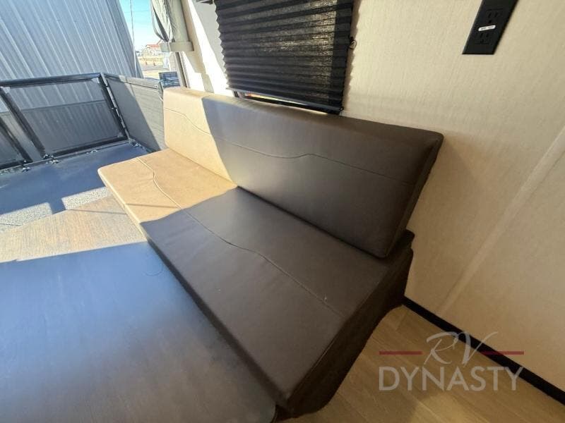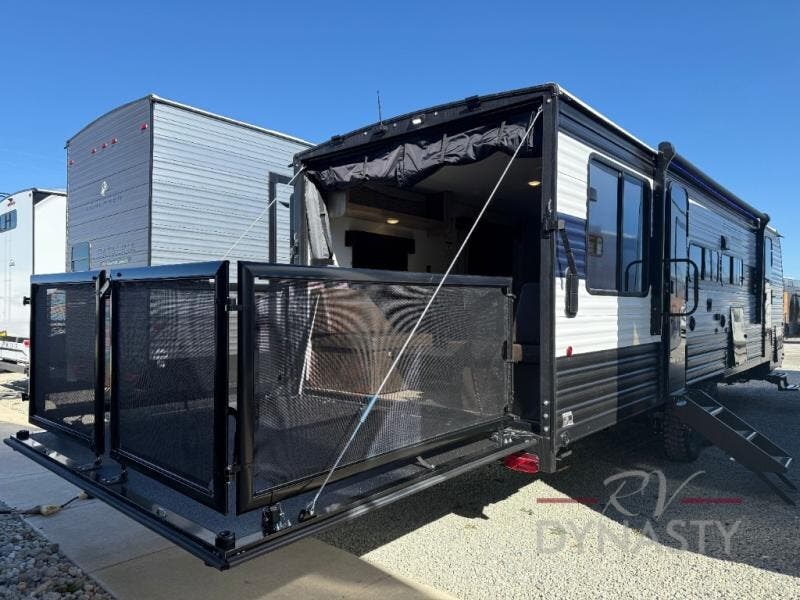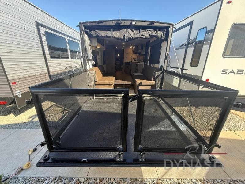 This dual entry toy hauler will allow you to enter in through the main living area or the front master bedroom for convenience! There is a walk-through bath that will be easily accessible for everyone, and there is plenty of storage space for personal belongings. Head to the full kitchen to prepare a home cooked meal, or head outdoors to enjoy the mini kitchen. There is also an outside TV mount if you brought a TV along, and a 15' awning to provide shade. You can easily unload your toys using the ramp door, then relax on the fold-down sofas with a removable table.