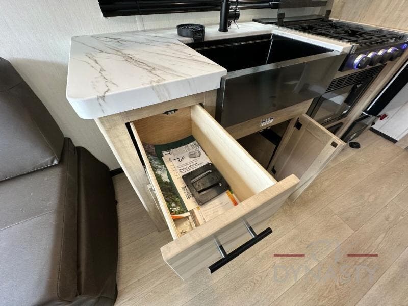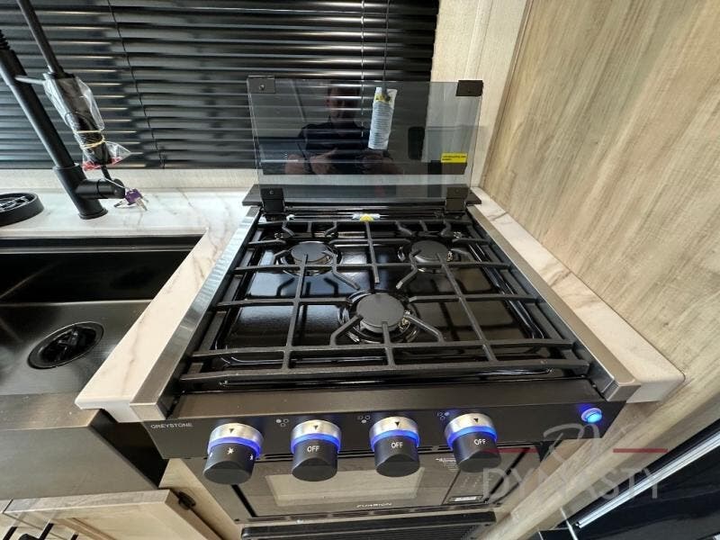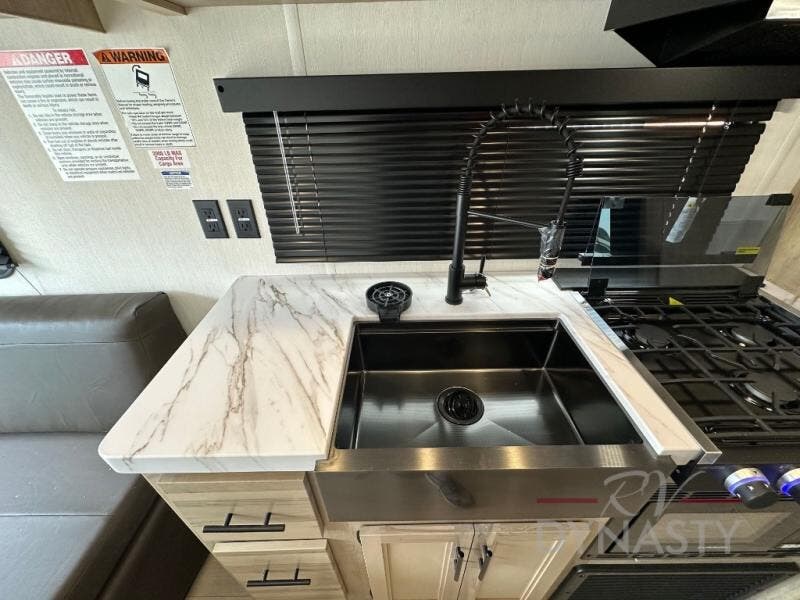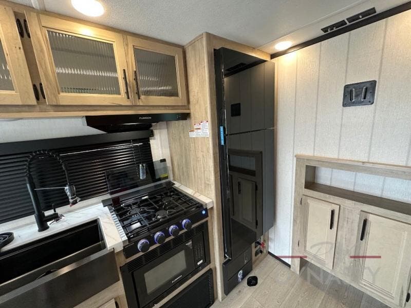 Take this Cherokee Grey Wolf toy hauler out to the campground of your choice for loads of outdoor fun! Create delicious dinners with the fabulous features found in the kitchen, like air fryer and residential farm-style stainless steel sink. For a comfortable night of rest, head to the front master suite where you will find an RV king bed, dual wardrobes, and a TV mount. You will even be able to host any neighbors that drop by with the fold-down sofas and removable table.