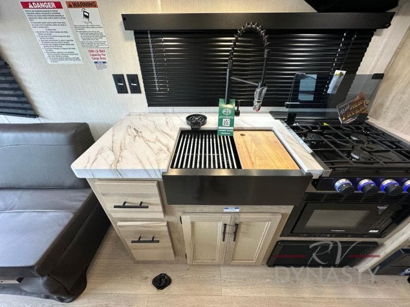 Take this Cherokee Grey Wolf toy hauler out to the campground of your choice for loads of outdoor fun! Create delicious dinners with the fabulous features found in the kitchen, like air fryer and residential farm-style stainless steel sink. For a comfortable night of rest, head to the front master suite where you will find an RV king bed, dual wardrobes, and a TV mount. You will even be able to host any neighbors that drop by with the fold-down sofas and removable table.