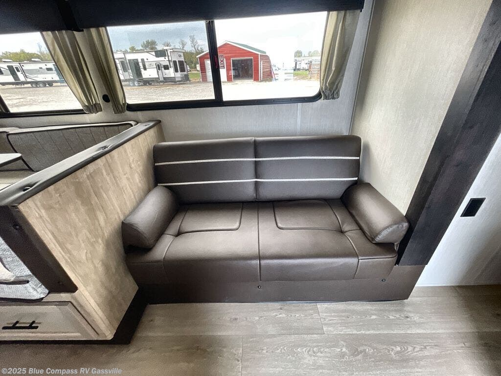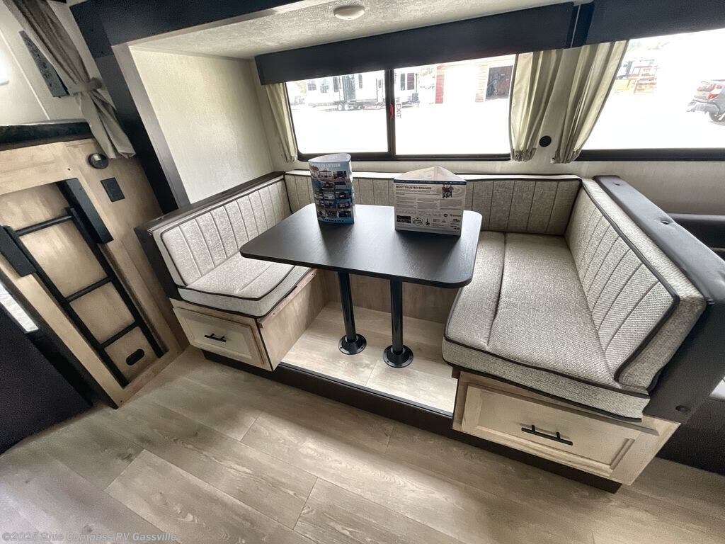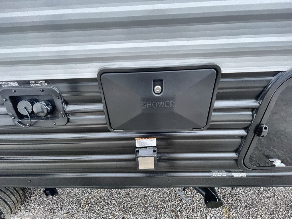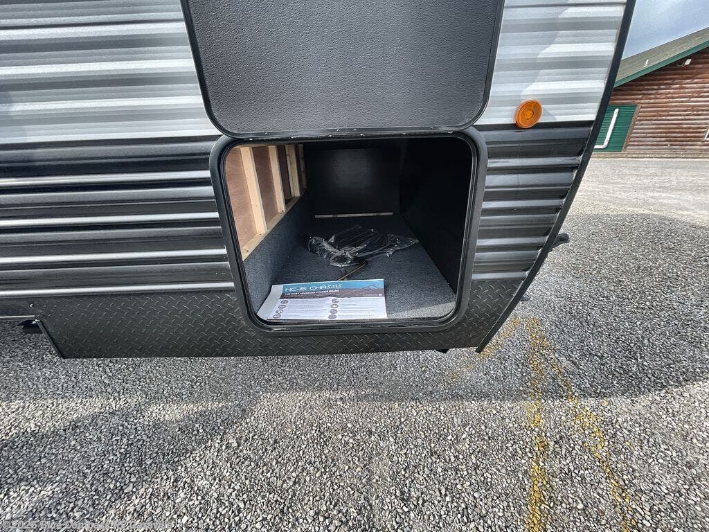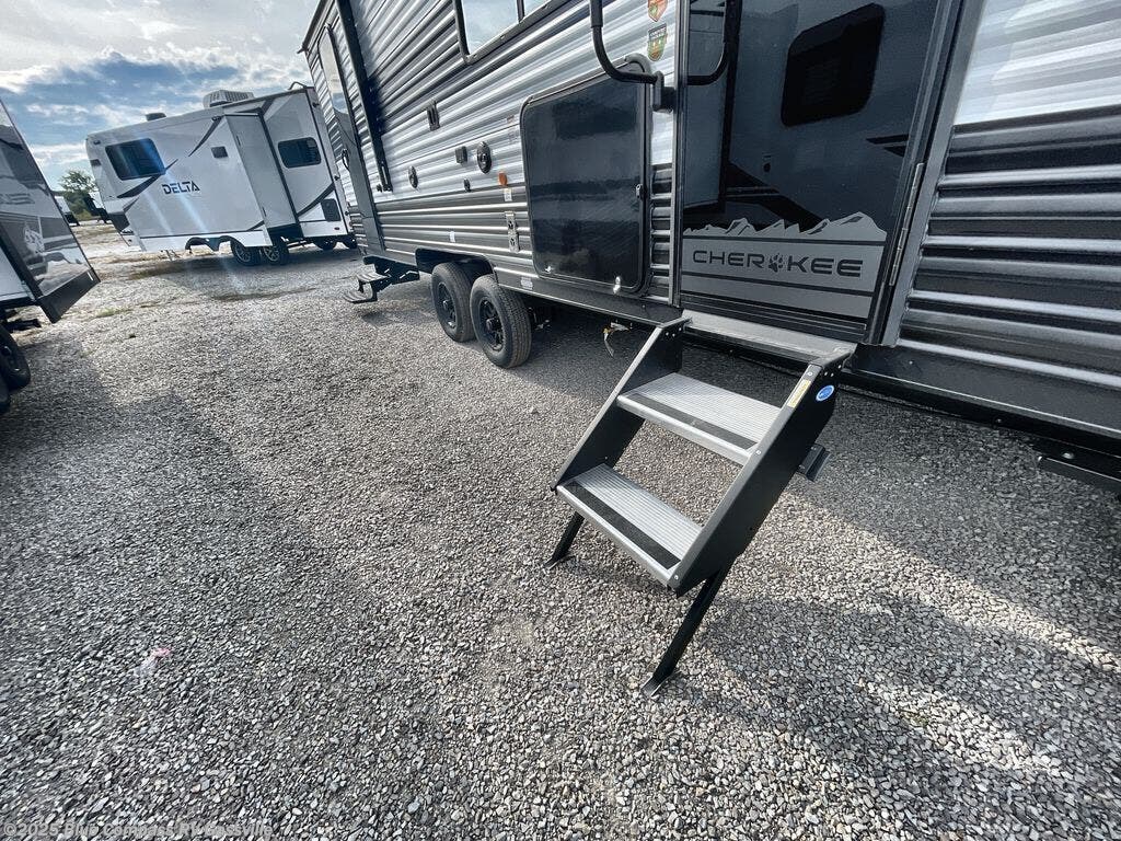 Come on inside this Cherokee Grey Wolf travel trailer and experience the convenience of a smooth flow of traffic in and out with two entry doors. The rear door leads into a full bath which is great for accessibility. Once inside, you will notice the large U-shaped dinette and the sofa which sit on the slide and create a spacious footprint for moving about, as well as great places to play games and socialize with your friends and family. A walk-in pantry provides plenty of storage allowing you to stock up on your favorite snacks and dry goods for your family adventure. At night, there is sleeping space for everyone between the double-size bunks and the RV king bed, plus the furniture.