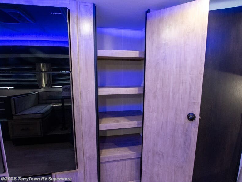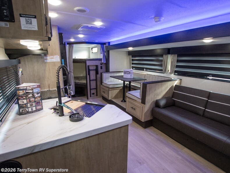 Come on inside this Cherokee Grey Wolf travel trailer and experience the convenience of a smooth flow of traffic in and out with two entry doors. The rear door leads into a full bath which is great for accessibility. Once inside, you will notice the large U-shaped dinette and the sofa which sit on the slide and create a spacious footprint for moving about, as well as great places to play games and socialize with your friends and family. A walk-in pantry provides plenty of storage allowing you to stock up on your favorite snacks and dry goods for your family adventure. At night, there is sleeping space for everyone between the double-size bunks and the RV king bed, plus the furniture.