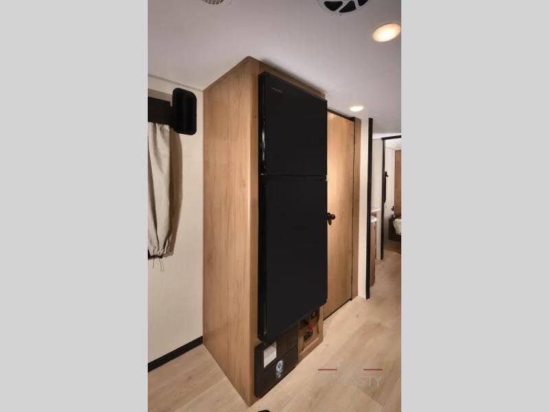 If you've been searching for a travel trailer with a larger sleeping capacity to camp with friends, this is the one! There are double-size bunks in the rear corner, and the full bath with its own exterior entry door is in the other rear corner for easy nighttime use. Up front, an RV king bed in the private bedroom is sure to bring a great night's rest, and you'll find dual bedside wardrobes to keep your clothes picked up off of the floor. In the morning, everyone can meet in the main living room that includes a large slide out, U-shaped dinette, sofa, and a fireplace with a hidden pantry behind it for smart storage solutions. There is also a TV mount here for the option to bring along your television. An outside mini kitchen will allow you to get some fresh air as you make dinner, but there's also a full interior kitchen if the weather isn't cooperating. Additional outdoor features include a rear storage rack, an outside TV mount, and a 9' power awning for some shade!