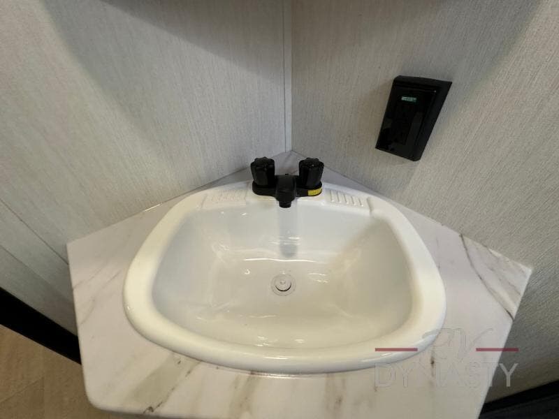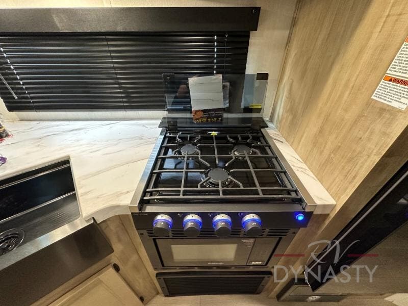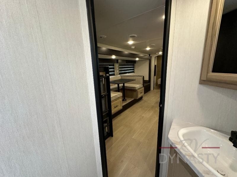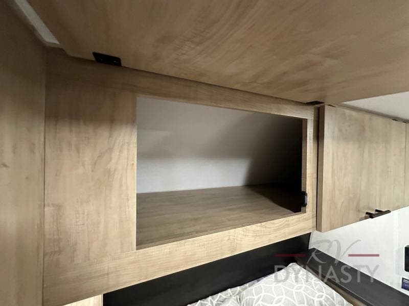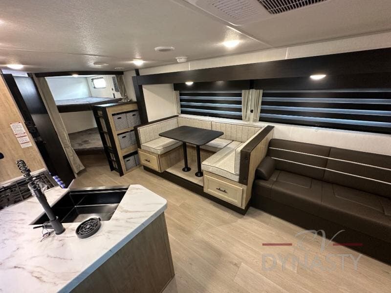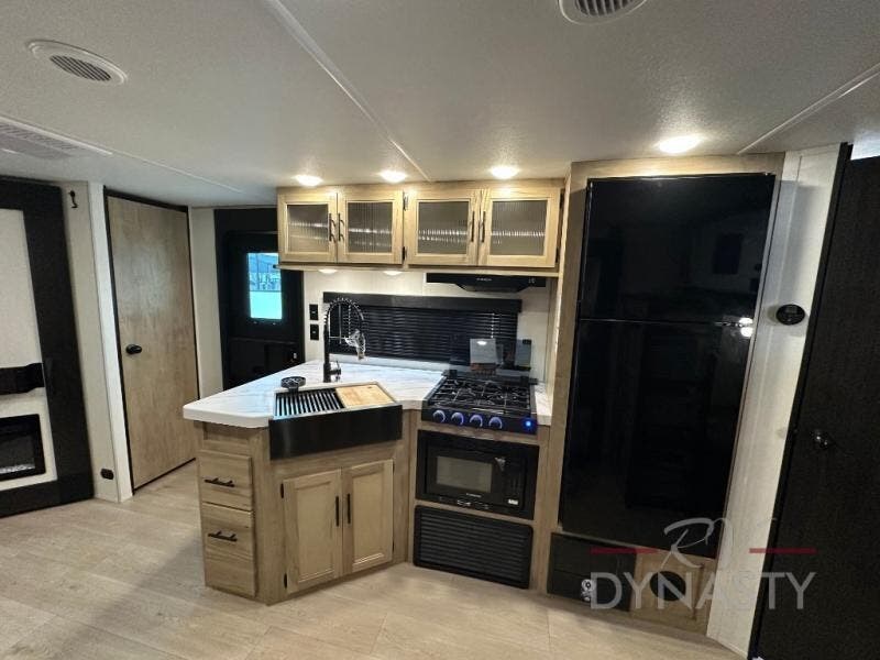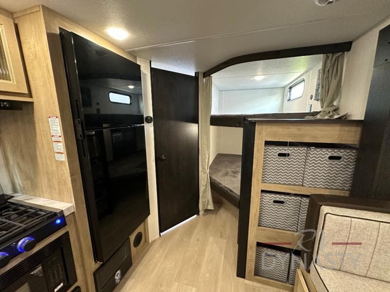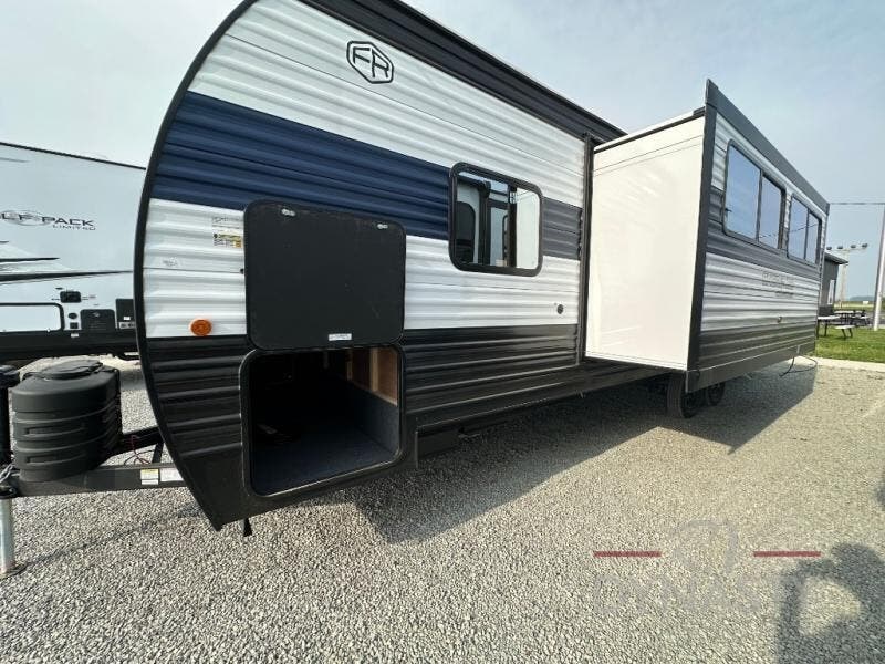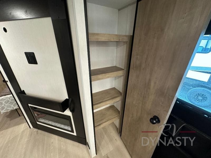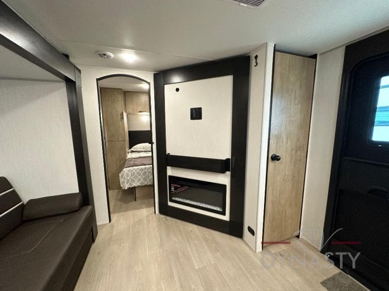 If you've been searching for a travel trailer with a larger sleeping capacity to camp with friends, this is the one! There are double-size bunks in the rear corner, and the full bath with its own exterior entry door is in the other rear corner for easy nighttime use. Up front, an RV king bed in the private bedroom is sure to bring a great night's rest, and you'll find dual bedside wardrobes to keep your clothes picked up off of the floor. In the morning, everyone can meet in the main living room that includes a large slide out, U-shaped dinette, sofa, and a fireplace with a hidden pantry behind it for smart storage solutions. There is also a TV mount here for the option to bring along your television. An outside mini kitchen will allow you to get some fresh air as you make dinner, but there's also a full interior kitchen if the weather isn't cooperating. Additional outdoor features include a rear storage rack, an outside TV mount, and a 9' power awning for some shade!