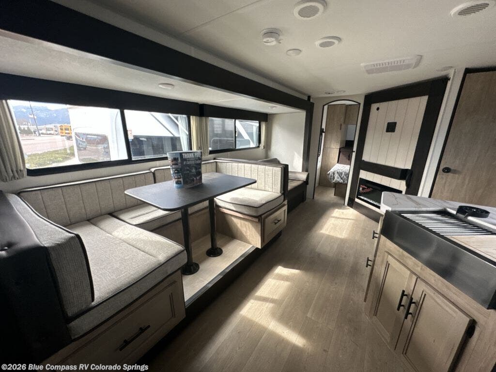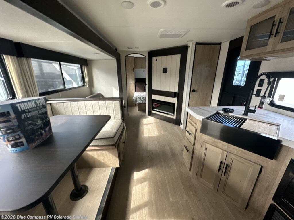 If you've been searching for a travel trailer with a larger sleeping capacity to camp with friends, this is the one! There are double-size bunks in the rear corner, and the full bath with its own exterior entry door is in the other rear corner for easy nighttime use. Up front, an RV king bed in the private bedroom is sure to bring a great night's rest, and you'll find a bedside wardrobe to keep your clothes picked up off of the floor. In the morning, everyone can meet in the main living room that includes a large slide out, U-shaped dinette, sofa, and a fireplace with a hidden pantry behind it for smart storage solutions. An outside kitchen will allow you to get some fresh air as you make dinner, but there's also a full interior kitchen if the weather isn't cooperating. Additional outdoor features include a rear storage rack, an outside TV mount, and a 15' awning for some shade!
