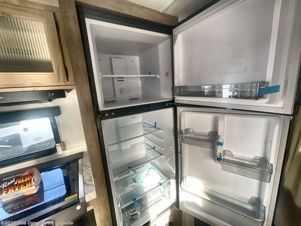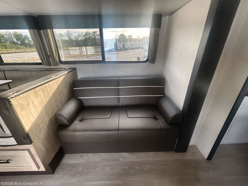 If you've been searching for a travel trailer with a larger sleeping capacity to camp with friends, this is the one! There are double-size bunks in the rear corner, and the full bath with its own exterior entry door is in the other rear corner for easy nighttime use. Up front, an RV king bed in the private bedroom is sure to bring a great night's rest, and you'll find a bedside wardrobe to keep your clothes picked up off of the floor. In the morning, everyone can meet in the main living room that includes a large slide out, U-shaped dinette, sofa, and a fireplace with a hidden pantry behind it for smart storage solutions. An outside kitchen will allow you to get some fresh air as you make dinner, but there's also a full interior kitchen if the weather isn't cooperating. Additional outdoor features include a rear storage rack, an outside TV mount, and a 15' awning for some shade!