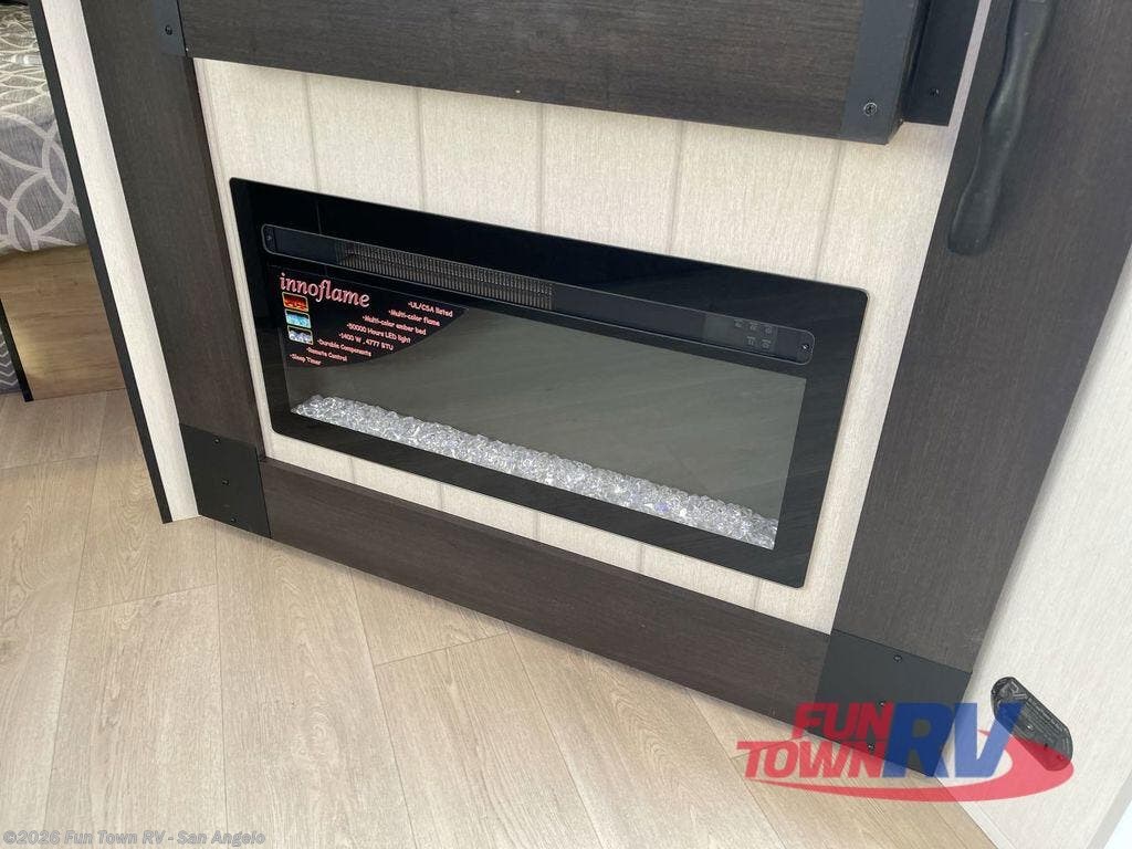 If you've been searching for a travel trailer with a larger sleeping capacity to camp with friends, this is the one! There are double-size bunks in the rear corner, and the full bath with its own exterior entry door is in the other rear corner for easy nighttime use. Up front, an RV king bed in the private bedroom is sure to bring a great night's rest, and you'll find a bedside wardrobe to keep your clothes picked up off of the floor. In the morning, everyone can meet in the main living room that includes a large slide out, U-shaped dinette, sofa, and a fireplace with a hidden pantry behind it for smart storage solutions. An outside kitchen will allow you to get some fresh air as you make dinner, but there's also a full interior kitchen if the weather isn't cooperating. Additional outdoor features include a rear storage rack, an outside TV mount, and a 15' awning for some shade!