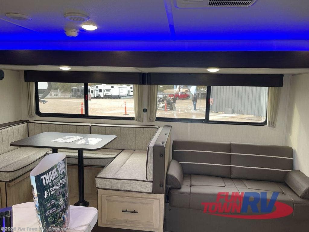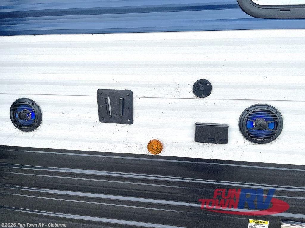 If you've been searching for a travel trailer with a larger sleeping capacity to camp with friends, this is the one! There are double-size bunks in the rear corner, and the full bath with its own exterior entry door is in the other rear corner for easy nighttime use. Up front, an RV king bed in the private bedroom is sure to bring a great night's rest, and you'll find a bedside wardrobe to keep your clothes picked up off of the floor. In the morning, everyone can meet in the main living room that includes a large slide out, U-shaped dinette, sofa, and a fireplace with a hidden pantry behind it for smart storage solutions. An outside kitchen will allow you to get some fresh air as you make dinner, but there's also a full interior kitchen if the weather isn't cooperating. Additional outdoor features include a rear storage rack, an outside TV mount, and a 15' awning for some shade!