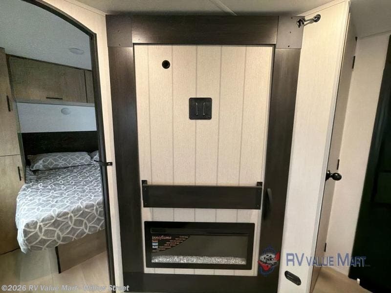 If you've been searching for a travel trailer with a larger sleeping capacity to camp with friends, this is the one! There are double-size bunks in the rear corner, and the full bath with its own exterior entry door is in the other rear corner for easy nighttime use. Up front, an RV king bed in the private bedroom is sure to bring a great night's rest, and you'll find a bedside wardrobe to keep your clothes picked up off of the floor. In the morning, everyone can meet in the main living room that includes a large slide out, U-shaped dinette, sofa, and a fireplace with a hidden pantry behind it for smart storage solutions. An outside kitchen will allow you to get some fresh air as you make dinner, but there's also a full interior kitchen if the weather isn't cooperating. Additional outdoor features include a rear storage rack, an outside TV mount, and a 15' awning for some shade!