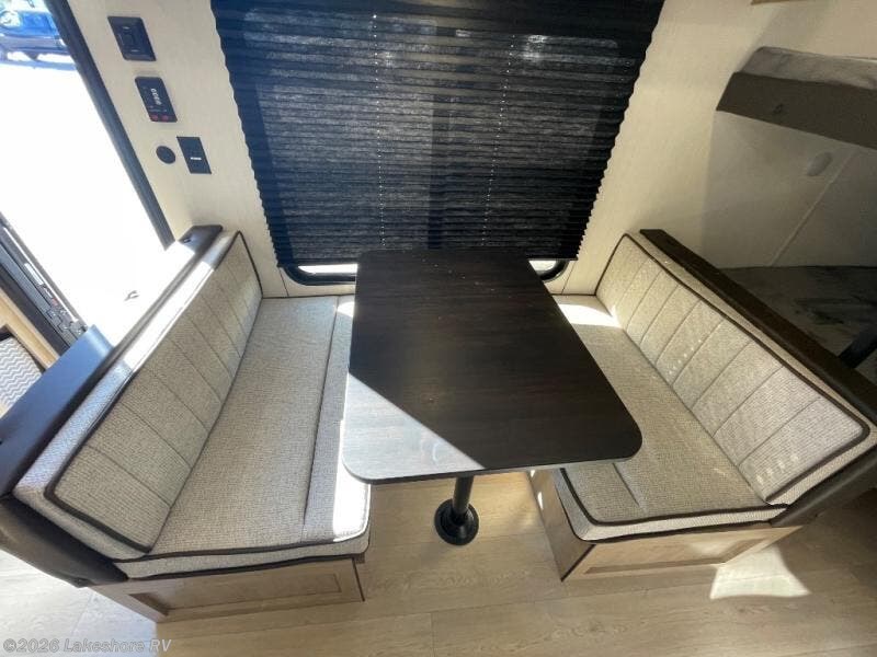 The double-size bunks in this model will allow you to camp with more friends and family! With the additional queen bed up front, plus the sofa and booth dinette, you can sleep eight! A full kitchen lets you make meals each day, and the full bath includes a tub/shower so you can clean up after hiking. This unit also includes USB ports to keep your electronics charged, and outside storage for your camp gear!