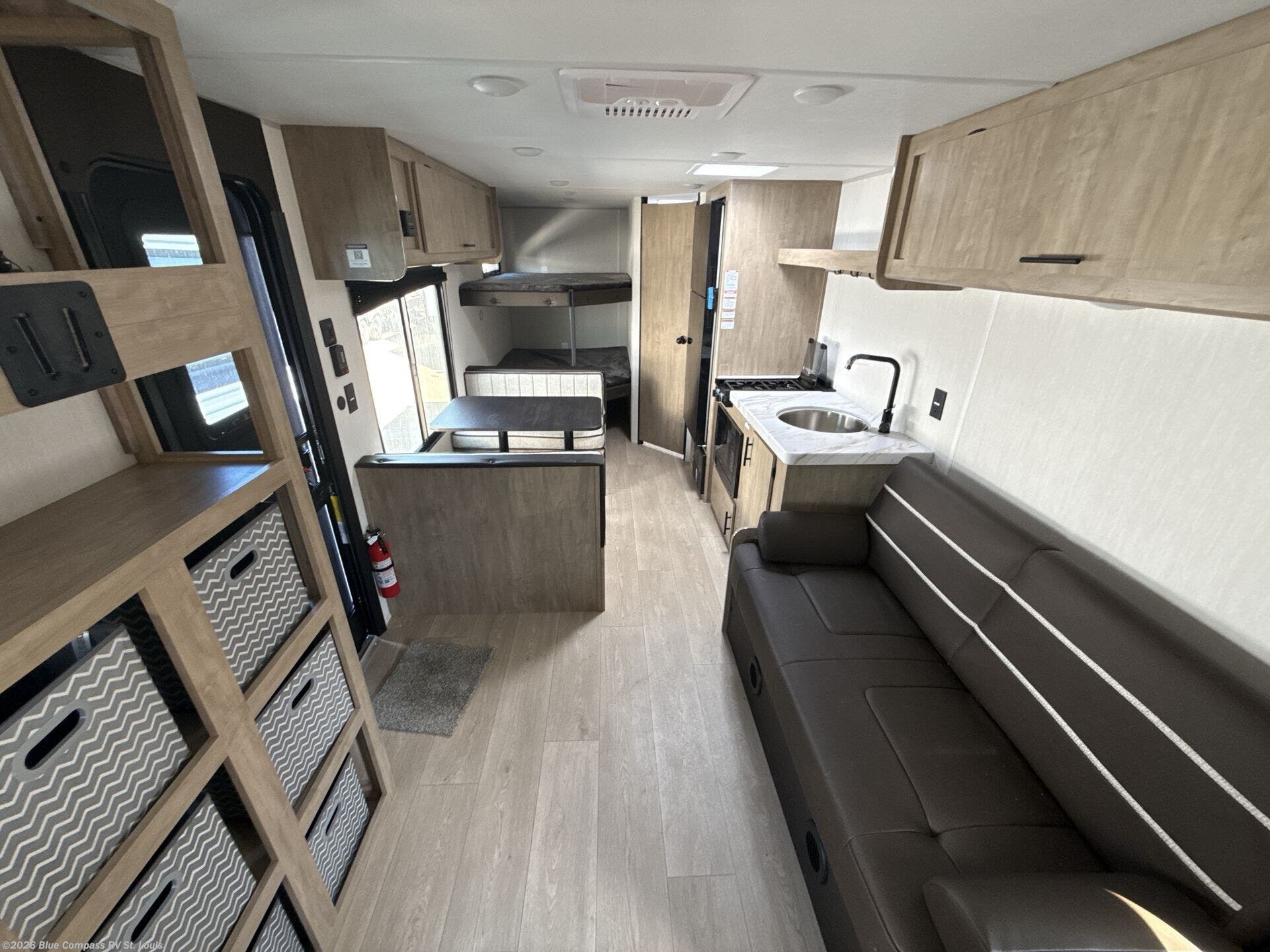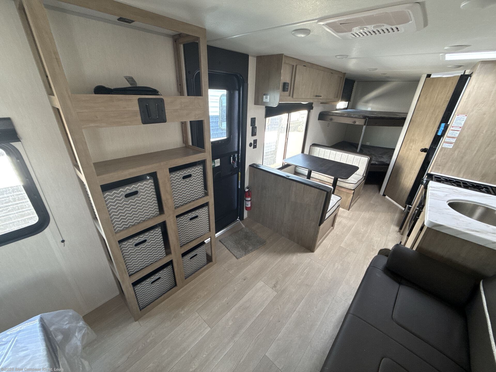 The double-size bunks in this model will allow you to camp with more friends and family! With the additional queen bed up front, plus the sofa and booth dinette, you can sleep eight! A full kitchen lets you make meals each day, and the full bath includes a tub/shower so you can clean up after hiking. This unit also includes USB ports to keep your electronics charged, and outside storage for your camp gear!